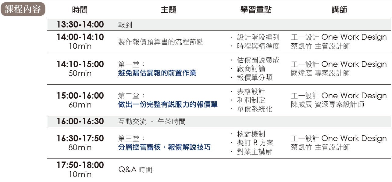 設計要到位、業主要爽快買單,同時設計公司還要獲得一定的利潤,這才是讓人痛快的設計!工一設計One Work Design首次公開設計報價的內控思維邏輯,分享平衡設計感性與經營理性的摸索之路,透過制定工作流程與權責歸屬,創造分工又互補的團隊即戰力!