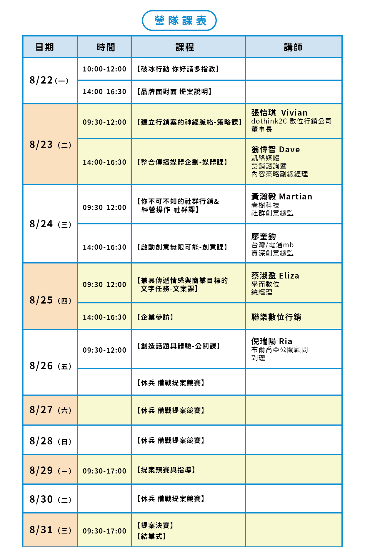 - 每組時間為25分鐘,前15分鐘為提案時間,後10分鐘為Q&A與指導。