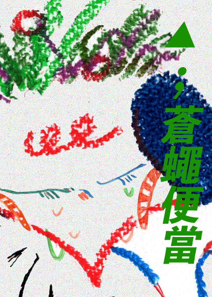 ▲ ; 蒼蠅便當 靈感來自路上觀察、家庭關係、魔法少女道具和吉祥物們,跟著吉祥牌顏彩手繪成抽象又曖昧不明的形體,成為獨特的世界觀。作品現身於各大藝術書展,近期也參與草率簿創作。