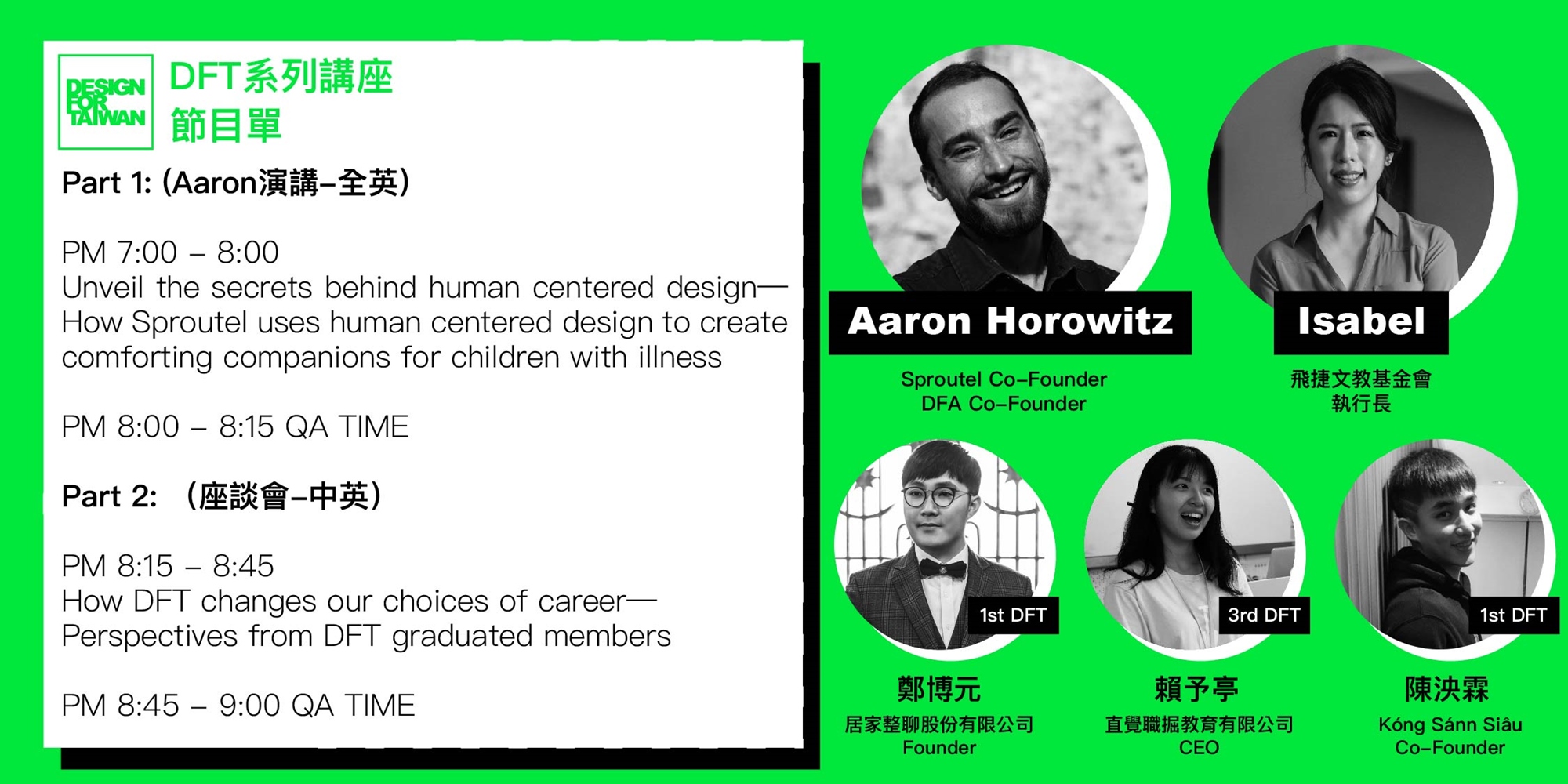 由飛捷文教基金會執行長-Isabel擔任主持人,將與Aaron及三位Design For Taiwan(DFT)的學長姊,分別是來自第一屆DFT的居家整聊室創辦人-鄭博元、Kóng Sánn Siâu共同創辦人-陳泱霖、以及第三屆的直覺職掘共同創辦人-賴予亭,透過線上座談的方式,從各自創業及求學的視角,分享他們如何將DFT的經驗,轉化為人生的養分,改變自己的人生!