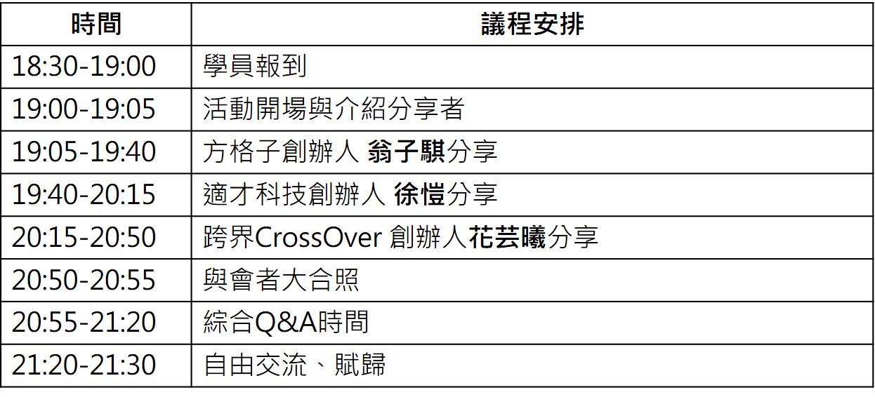 邀請在相同領域闖盪的創業家與新創基地進駐團隊共同交流商業歷程觀點,以分享形式暢談創業想法和創業經驗,增加新創認識和合作的機會!