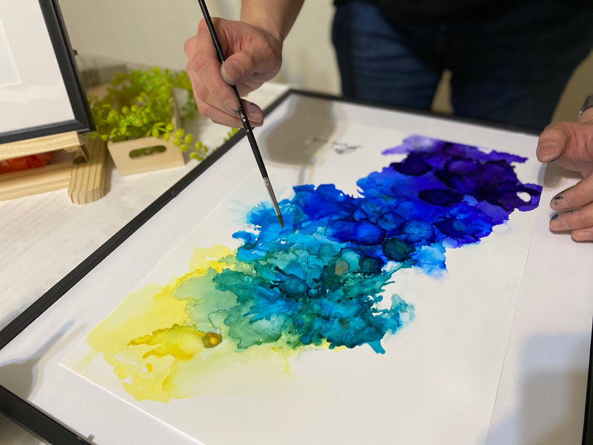 創作完全不需要畫筆,只需要讓墨水在紙張上恣意流動,你可以運用吹塵球、滴管等工具完成你的抽象藝術繪畫。