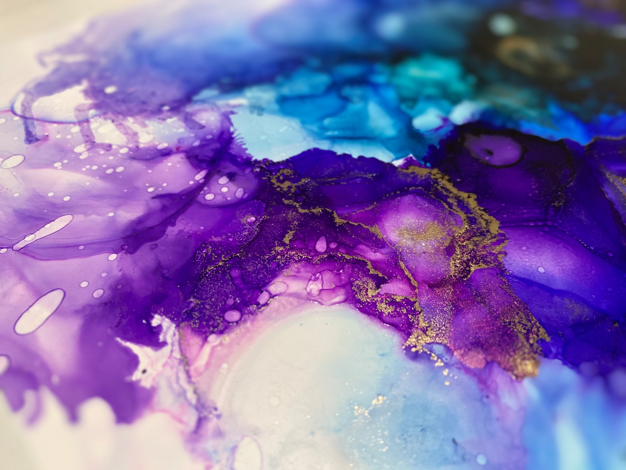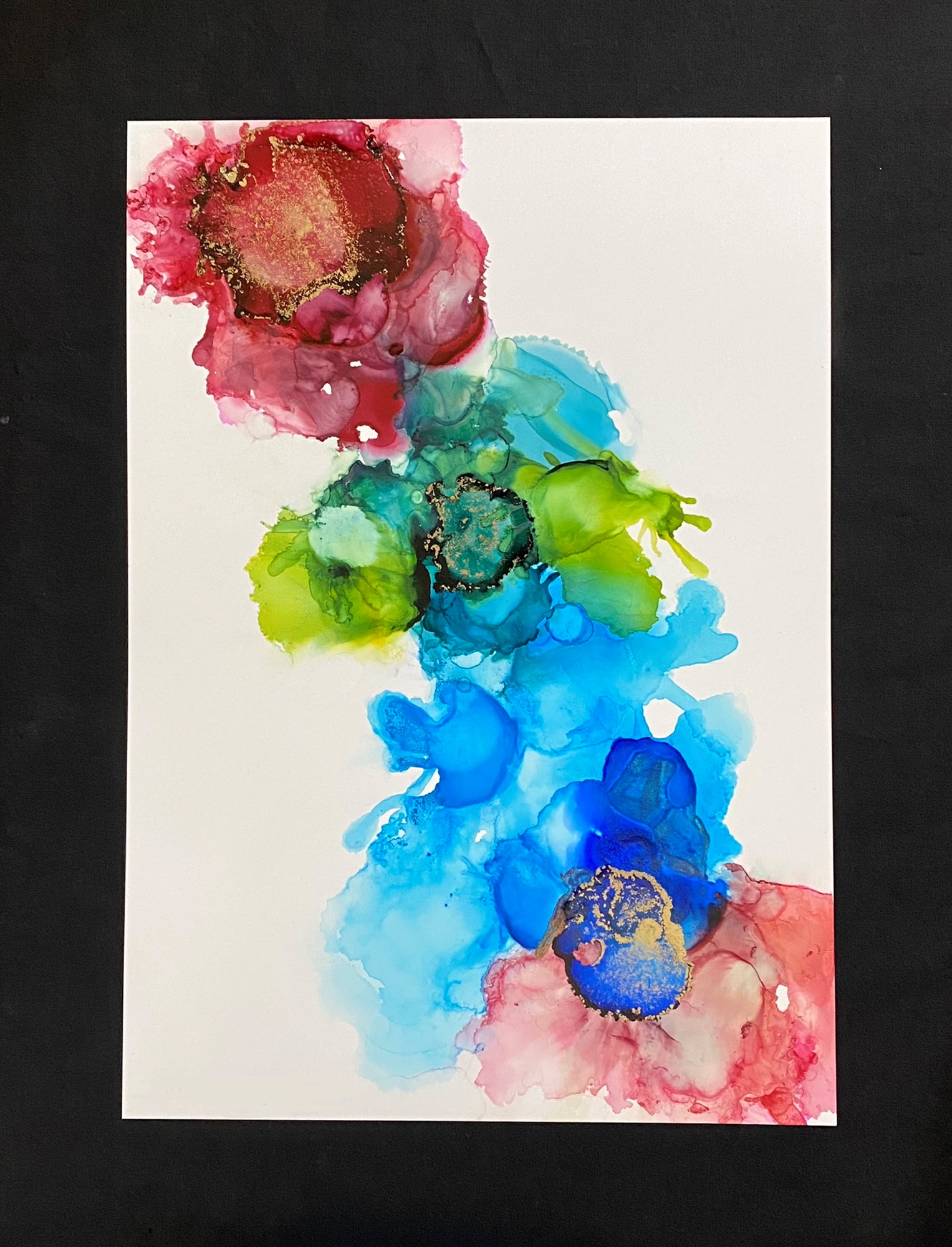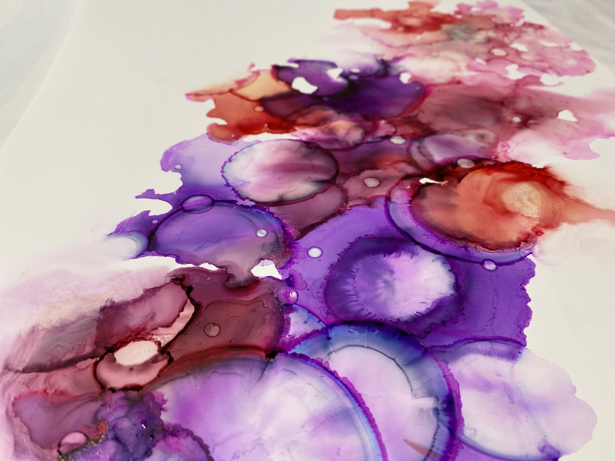 夢幻的色彩,在紙張上自然的暈染、擴散交疊,酒精墨水畫擁有水彩的渲染特性,卻也更多了自在的寫意!
