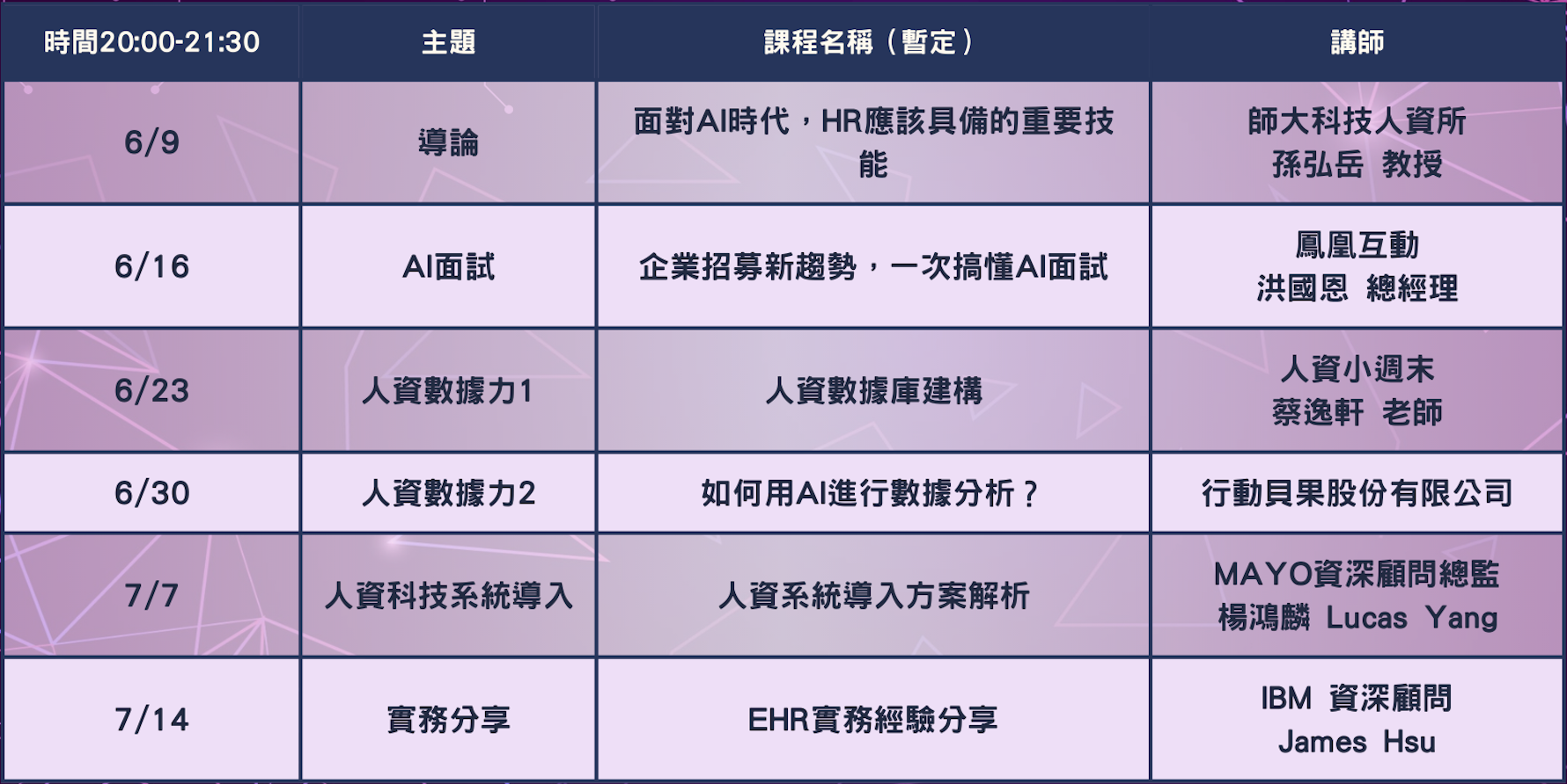 上課日 : 2022-06-09 ~ 2022-07-14 (每週四20:00 ~ 21:30 )