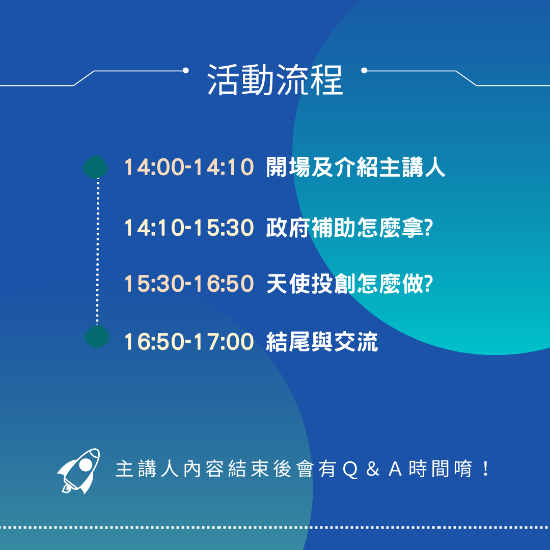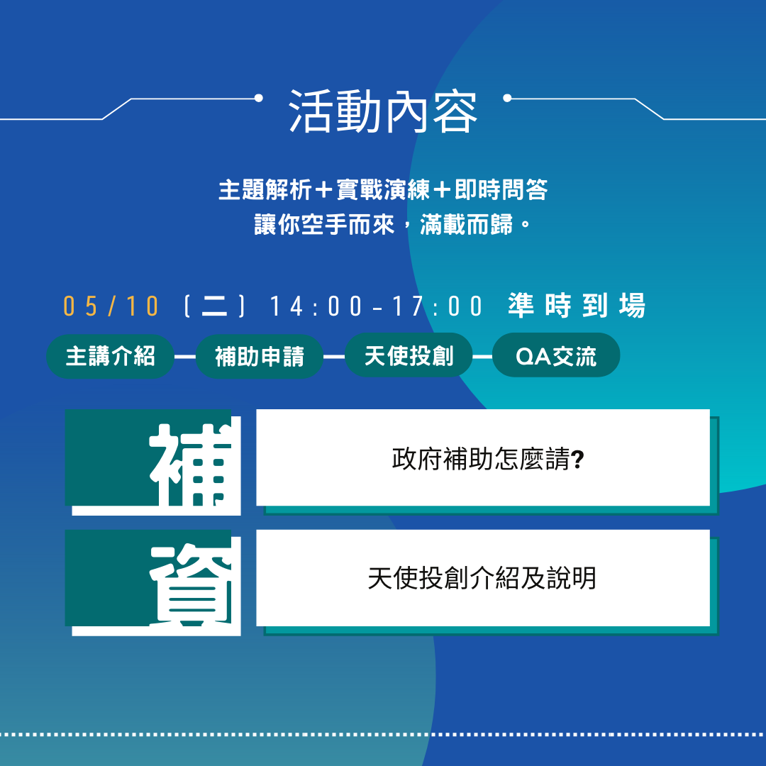 創業初期容易遇到許多瓶頸,研發產品時的資金怎麼來? 想申請補助卻不知從何寫起、想募集資金卻找不到金主? 本次講座邀請到兩位已在業界打滾多年的專業講師,政府補助案蔡秉翰顧問 及 天使投創 莊孟儒顧問、為你抽絲剝繭、娓娓道來! 保證你空手而來,滿載而歸。