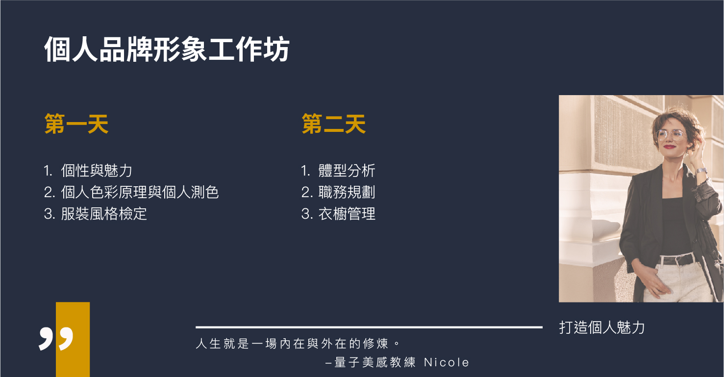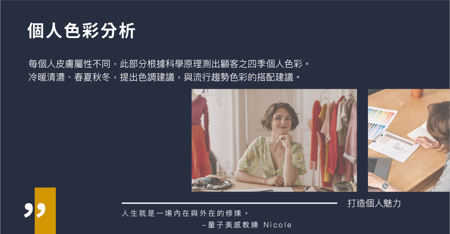 本服務針對個人一對一服務,依照個人色彩、體型、風格等因素,打造個人形象魅力。
