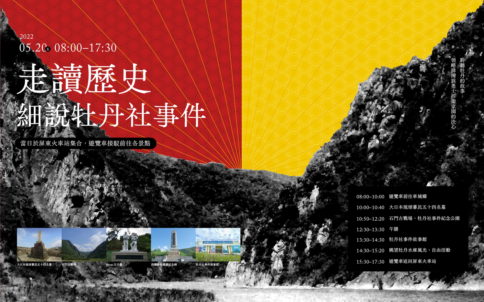 今年適逢牡丹社事件 148 週年,我們將帶領您深入牡丹社事件歷史場域,親自踏訪大日本琉球蕃民五十四名墓、石門古戰場、牡丹社紀念公園、牡丹社事件故事館,跟著族人一同紀念這起重要的歷史事件,聆聽關於牡丹鄉的在地故事。下午則暢遊牡丹社事件故事館,在牡丹水庫漫步,在重要之歷史場域沈澱心靈,領略百年前排灣族原住民奮勇抗戰、保衛家園的故事。