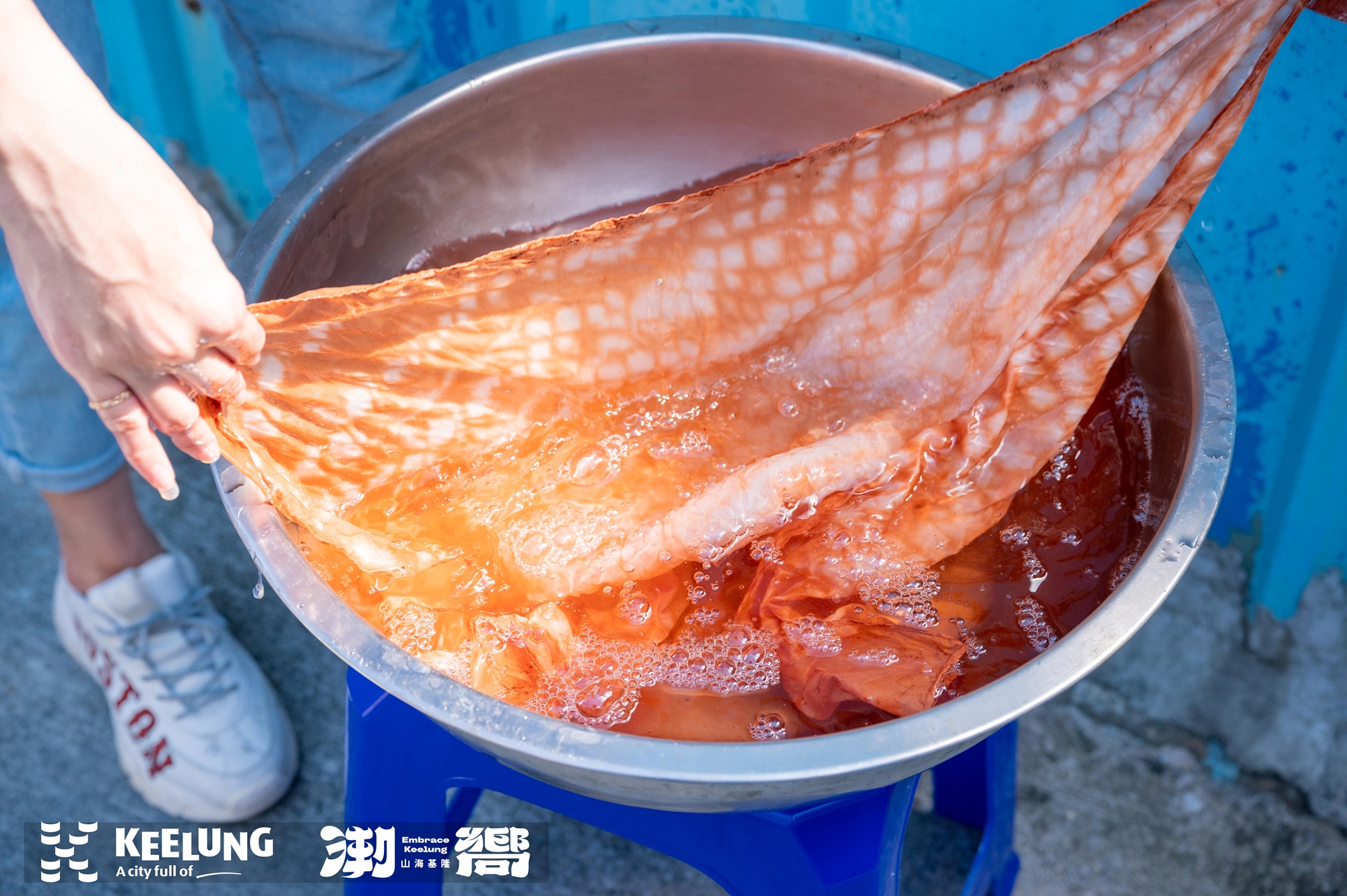 改以尼龍漁網捕魚的現在,這項漁村的傳統技藝轉為染布體驗,透過老師的教學,以折布、打結及纏布的技法,加入薯榔汁液煮沸上色後,就可以漂洗出屬於自己獨一無二的薯榔染布作品囉!