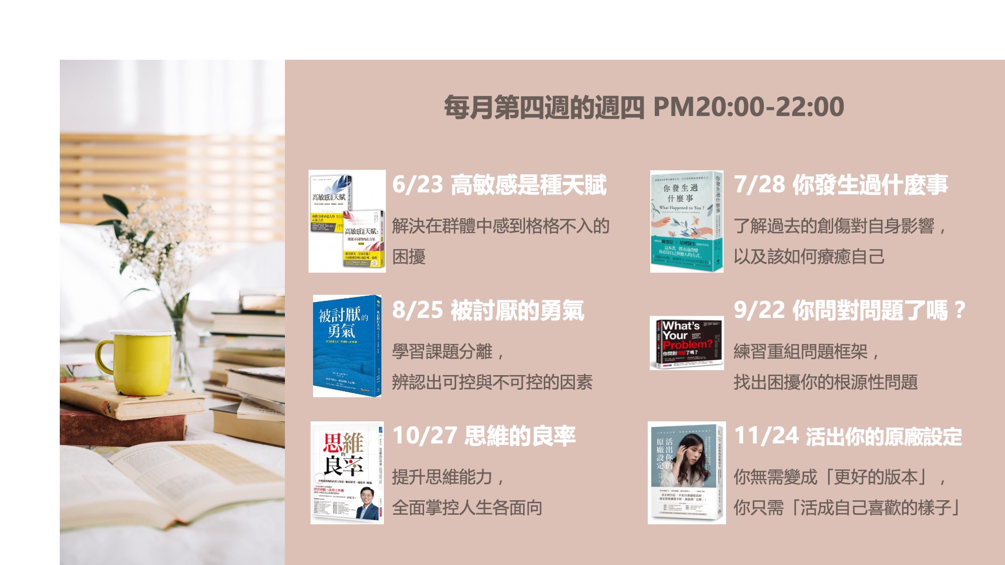 3、為維護每位參與者寶貴時間與權益,每場讀書會皆以20:00準時開始,請準時上線避免跟不上進度。