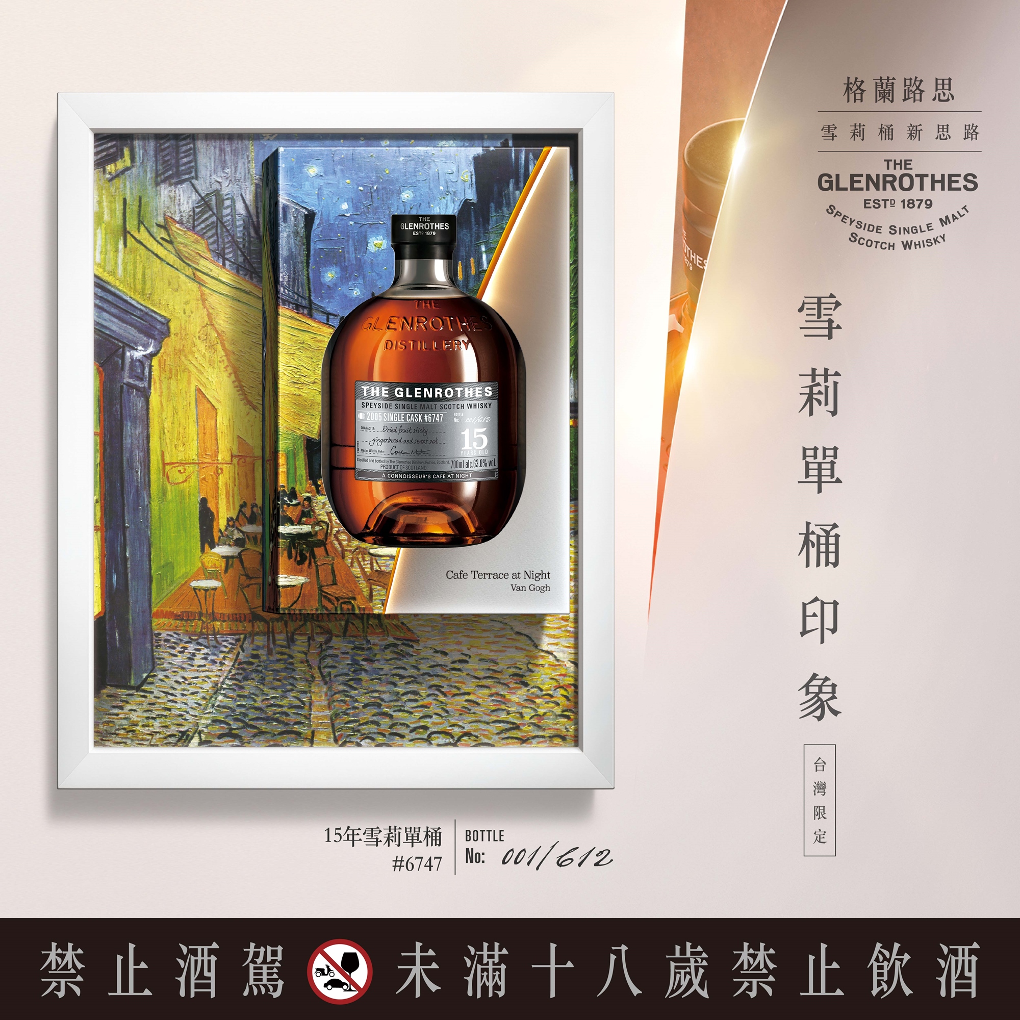 以印象派藝術大師梵谷的「夜晚露天咖啡座」為題,以2005年蒸餾的純淨新酒,在歐洲初次雪莉桶陳年。啜飲一口15年單桶原酒彷彿置身在微涼夜晚的露天咖啡座,清澈的夜空一如格蘭路思的純淨的酒體,豐富的果乾及甜美的薑餅像那天上的繁星,入喉後伴隨著太妃糖的香甜及優雅的木質調性尾韻,讓人回味無窮。