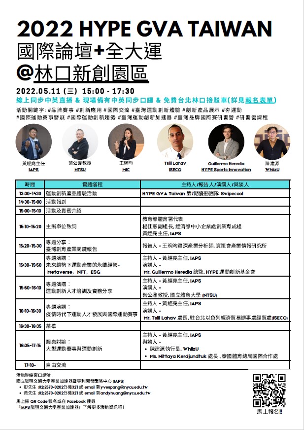 在教育部體育署指導與支持下,臺灣運動創新加速器 HYPE GVA Taiwan、中華民國全國中小企業總會,以及與國立體育大學將共同舉辦 「2022 HYPE GVA Taiwan 國際論壇+全大運」,以運動創新為主題,邀請國內外重量級講者交流討論。