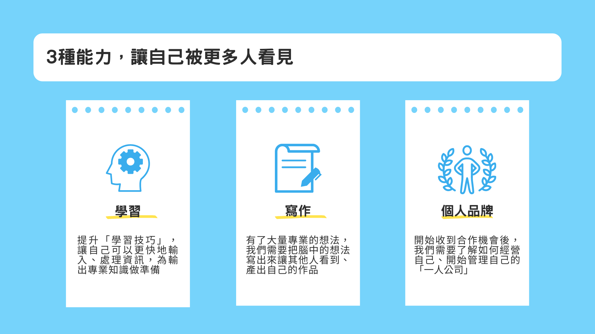 因此,我們需要把腦中的想法表現出來讓其他人看到。其中「寫作」學習門檻低、複利效果高的作法,把腦中的專業寫成一篇篇好讀又有用的文章,就能夠讓其他人發現我們的實力。