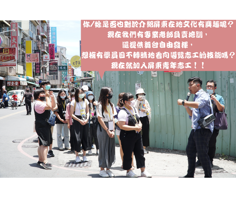 屏東市是首要的文教區,近年來青年卻逐漸流失,人口不斷縮減,有多少的人知道過去屏東的輝煌特色歷史,曾經的繁榮與景象你是否聽說?!屏東的文化特色需要向下傳承,更需要青年一起來參與,透過創新模式將屏東特色推廣出去,讓人潮進來並停留,屏東能被看見、青年能有機會,讓我們一起透過認識在地文化、學習導覽技巧,成為屏東重要文化的傳唱者吧!