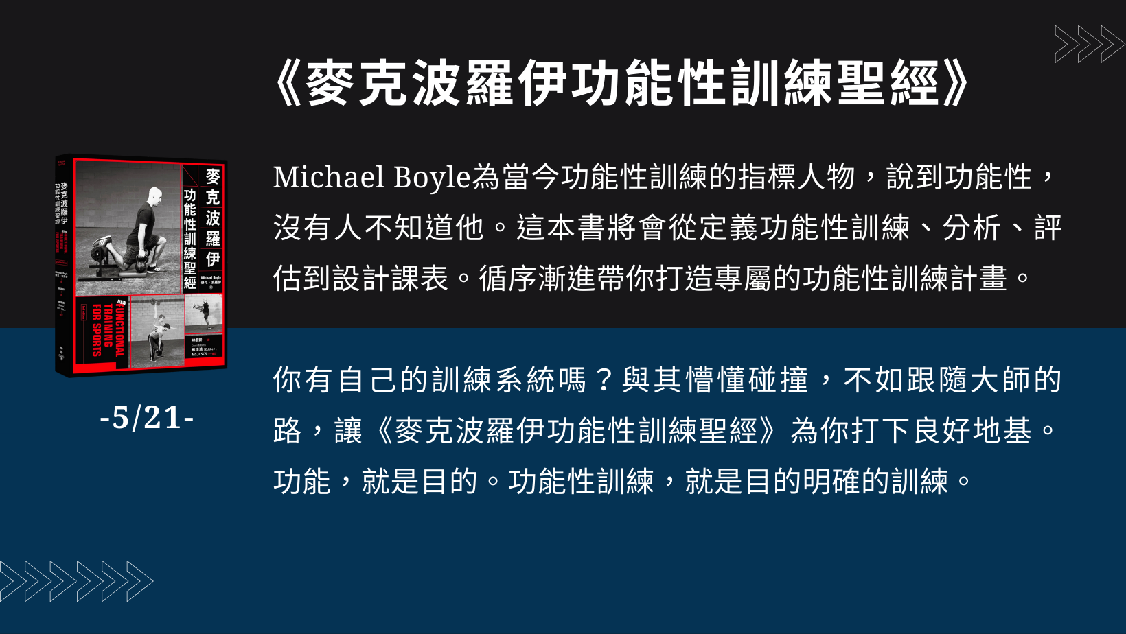 這本書將會從定義功能性訓練、分析、評估到設計課表。循序漸進帶你打造專屬的功能性訓練計畫。