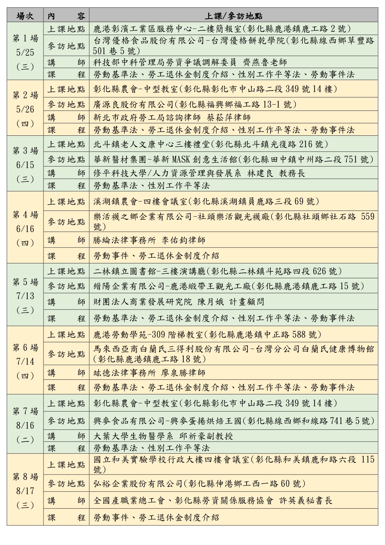 (二)本活動課程時間:08:30-15:30,唯第二場次課程時間變更為:08:00-15:00,欲報名第2場者,請注意報到時間為:08:00。
