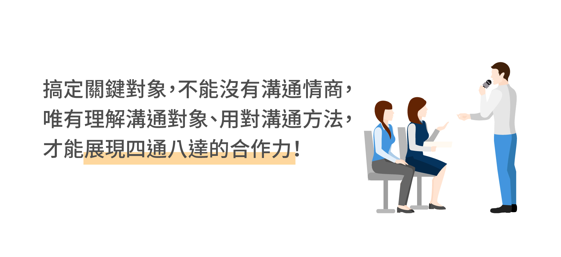 本課程從溝通的心態思維、表達傾聽提問,到四型人格風格的解析,讓每個人都學會因應不同的對象與情境來彈性地調整溝通方式,練就見人說人話的職場素養力!