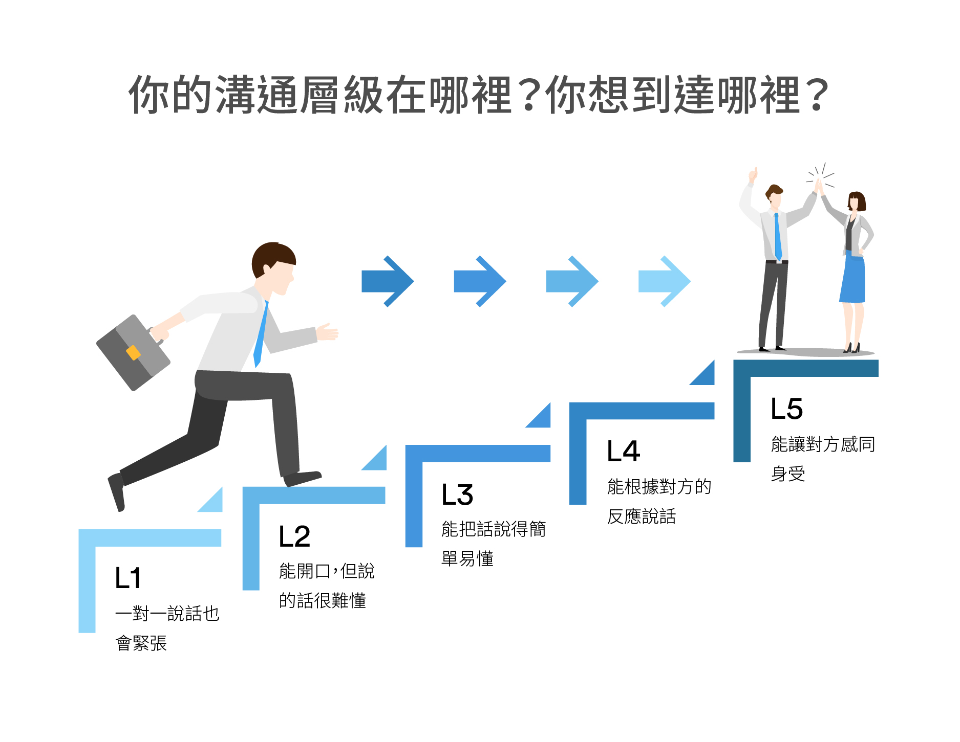 ⼀、高效溝通的核心認知 | 1. 表達、溝通、銷售、談判的本質差異與目的 2. 溝通能力L1~L5自我檢測 |