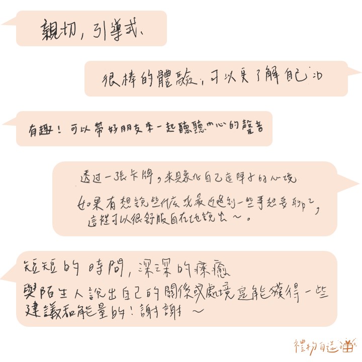 「抽到『自信』的當下蠻震驚,因為剛經歷一件非常有挑戰性的事情,那時候時常懷疑人生 。但透過跟講師的對話,漸漸發現自己的好,人在低落悲傷時,真的是很容易遺忘呢。」