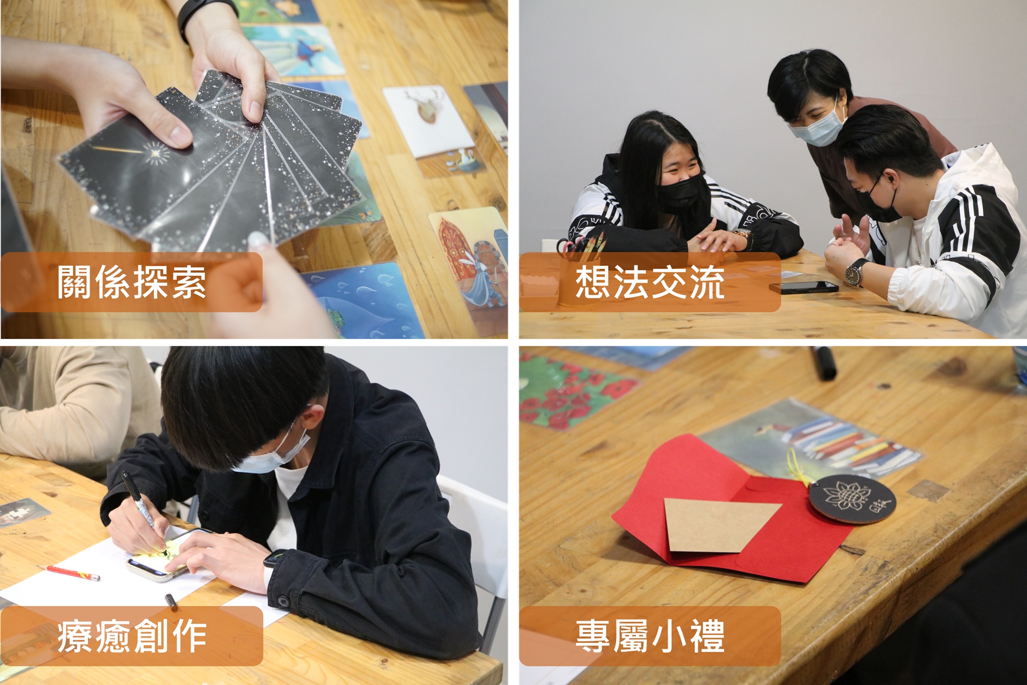 在茫茫牌卡中,找出與自己連結的畫面,抽出可能熟悉、可能陌生的關鍵詞,接著進入創作,畫下改變、溝通、承諾、聚焦...,最後再次深度交談,得到專屬的小吊飾。
