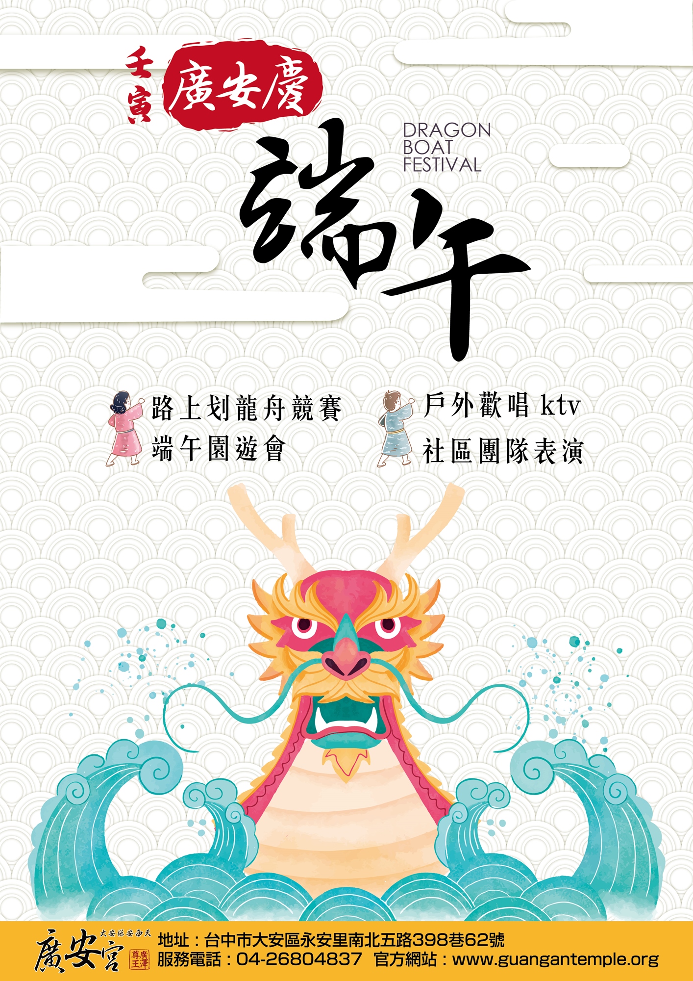 活動詳細資訊或報名參加「端午節陸上划龍舟競賽」,歡迎請洽廣安宮客服組,聯繫服務電話:04-2680-4837