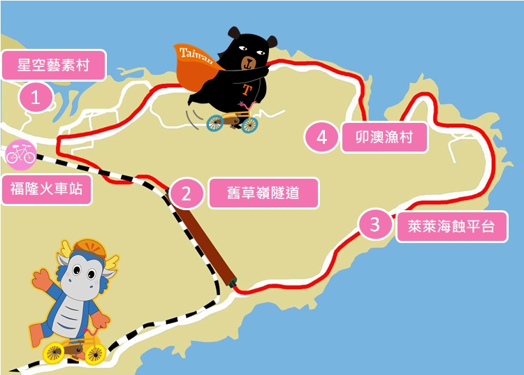 騎乘路線(東北角舊草嶺環狀自行車道) : 星空藝素村服務台集合→舊草嶺隧道→東北角濱海自行車專用道→萊萊海蝕平臺→四角窟觀景區→卯澳漁村導覽+石花凍DIY+點心→ 星空藝素村