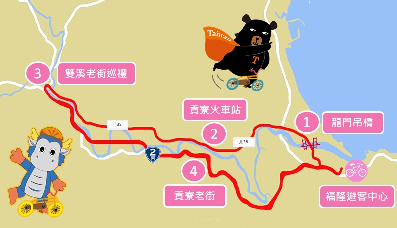 騎乘路線: 福隆火車站→龍門鹽寮自行車道→龍門吊橋 →沿北38接魚行道路往雙溪 →貢寮車站→雙溪單車停靠站→淡蘭古道第一個服務據點(注腳雙溪體驗農村DIY: 圓緣飯包)→雙溪渡船頭古厝→雙溪老街巡禮→東和戲院舊址→馬偕教會→淡蘭古道雙溪故事牆→貢寮老街→沿台2丙線返回福隆車站
