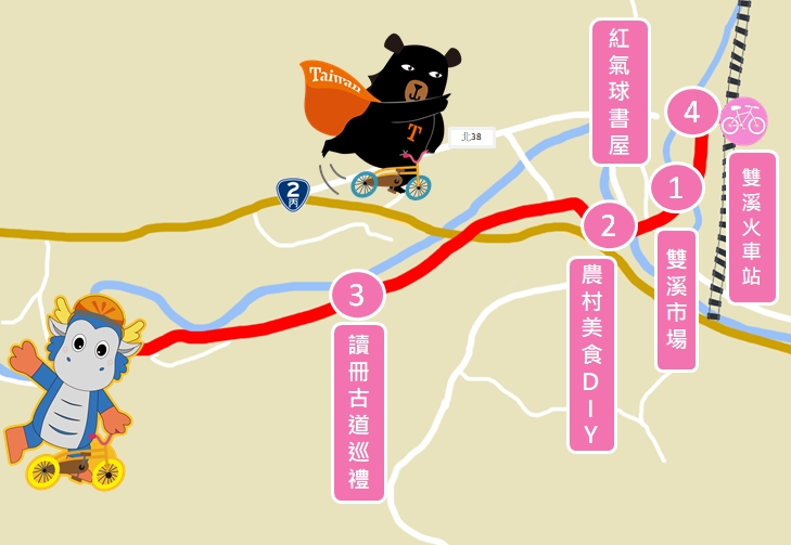 騎乘路線: 雙溪火車站→跟在地人逛菜市仔採購→農村創生飯包→騎遇雙溪老時光(在地故事-梅竹蹊文化路徑定點導覽:雙溪高中百年土地公故事牆、讀冊古道、麻竹坑古圳道、舉人厝、貢生厝、茶花莊)→返回雙溪車站→拜訪紅氣球書屋