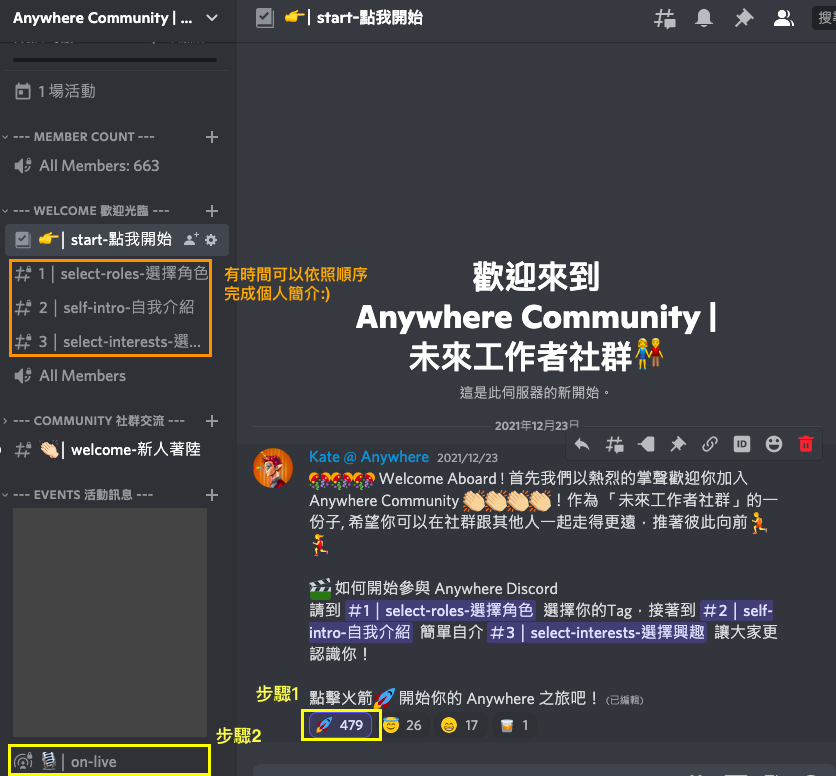 如果你還不會使用,可以參考手把手教學影片,進入後依照圖片【步驟1】點擊火箭 emoji 與【步驟2】到 on-live 頻道加入。