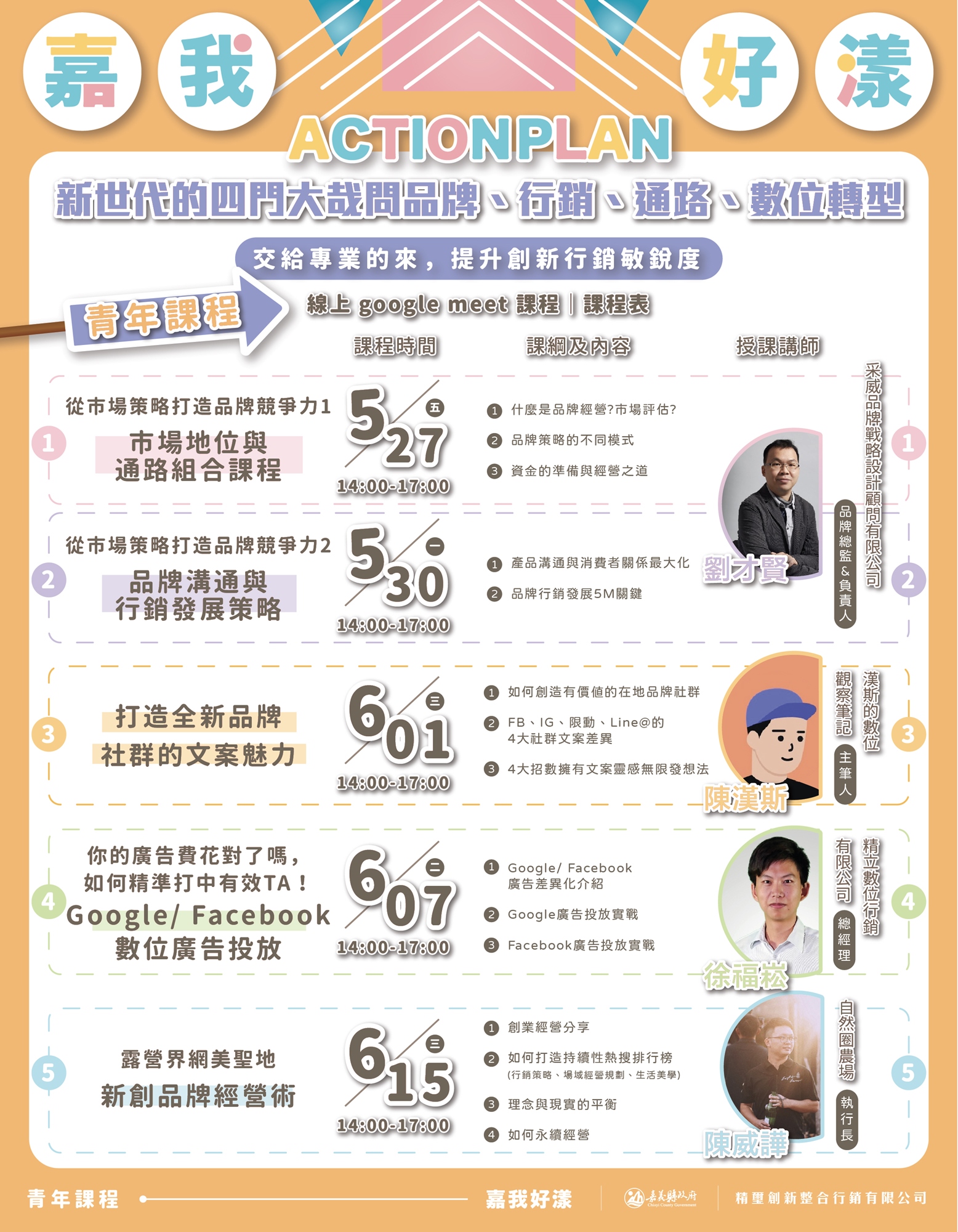2022嘉我好漾Action Plan,由嘉義縣政府勞工暨青年發展處主辦,為協助嘉義縣青年或是有創業想法的創業家,透過多面向的課程、參訪、論壇、工作坊及小聚等共學方式,探索發展自我能力、創新設計思考、了解產業趨勢及掌握時代脈絡,同時讓So Young的你們互相經驗、資源分享及交流,協力打造嘉義縣青年好漾故事。