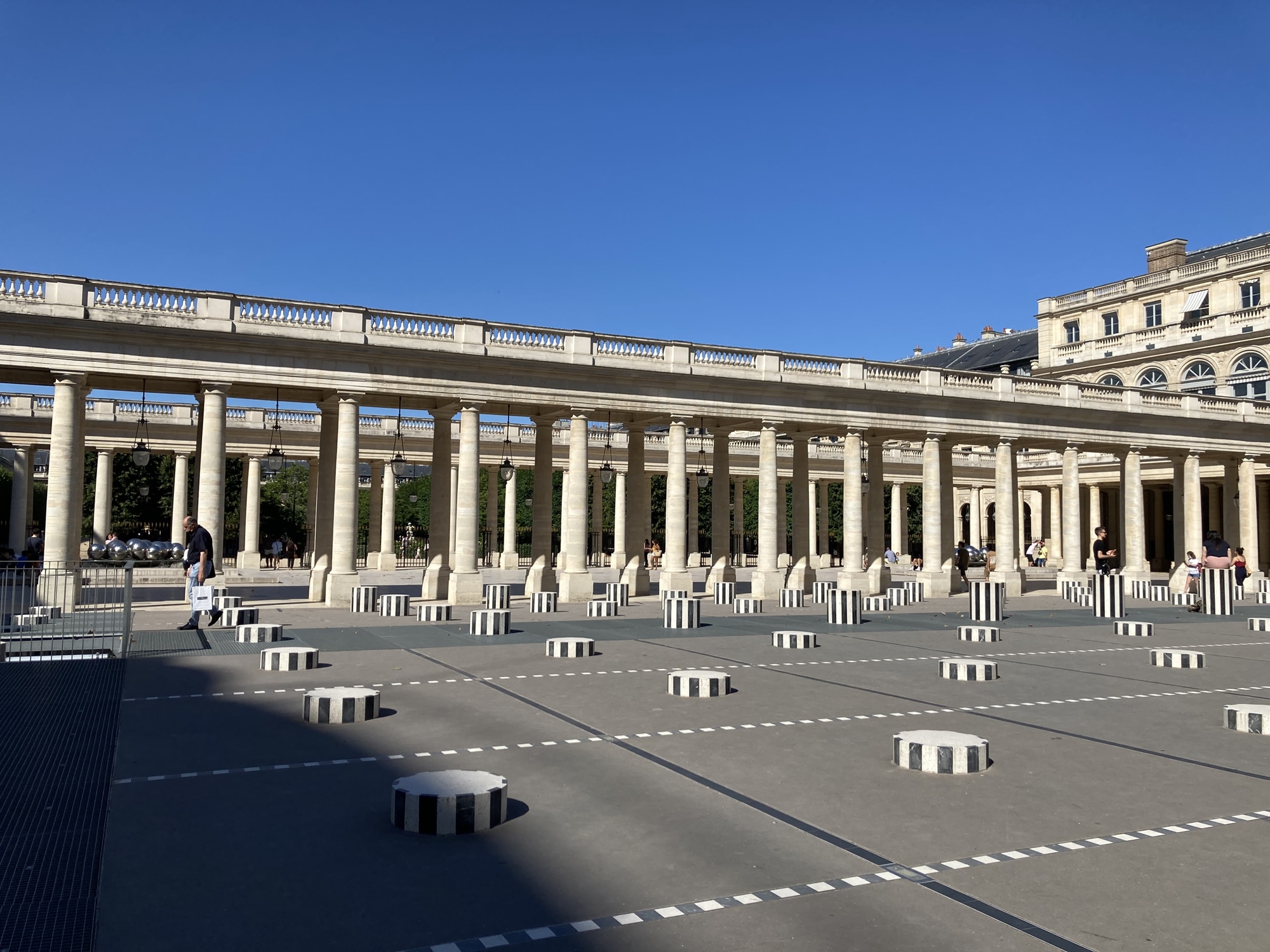 ▲ 這裡也曾是巴黎出現的最早的商鋪拱廊街,法國大革命期間這裡也成為思想和資訊交流的地方。如今皇家宮殿庭院內還能看到當代藝術家Daniel Buren著名的黑白柱,以及Pol Bury的拋光不銹鋼金屬球噴泉。
