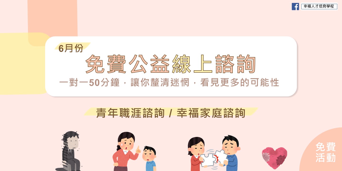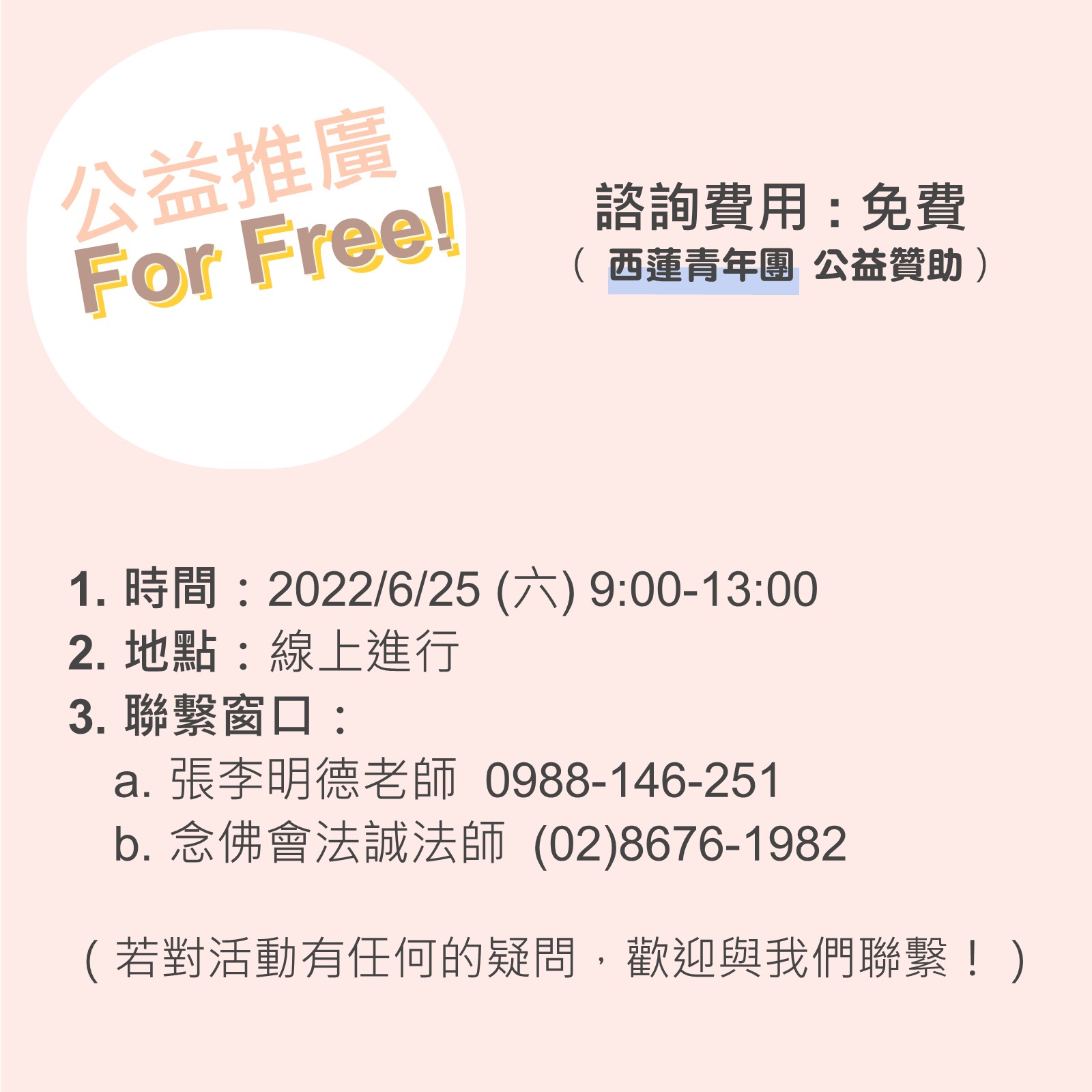 由於是公益諮詢,需麻煩您於諮詢後填寫至少300字的心得、收穫、感想,幫助我持續提供更好的公益服務,謝謝。