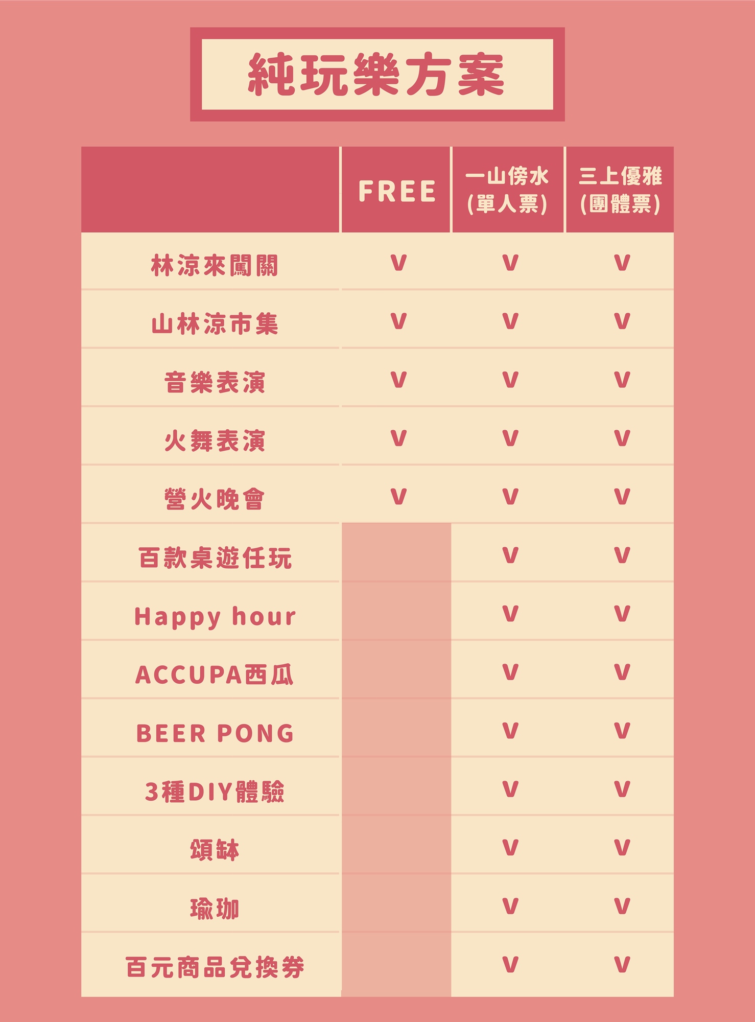 - 想要放鬆High一下:一張 ◤ 一山傍水票◥ 滿足你的願望!讓你逛市集、喝酒、聽歌、看表演、玩遊戲,林涼乎哩玩到爽!!