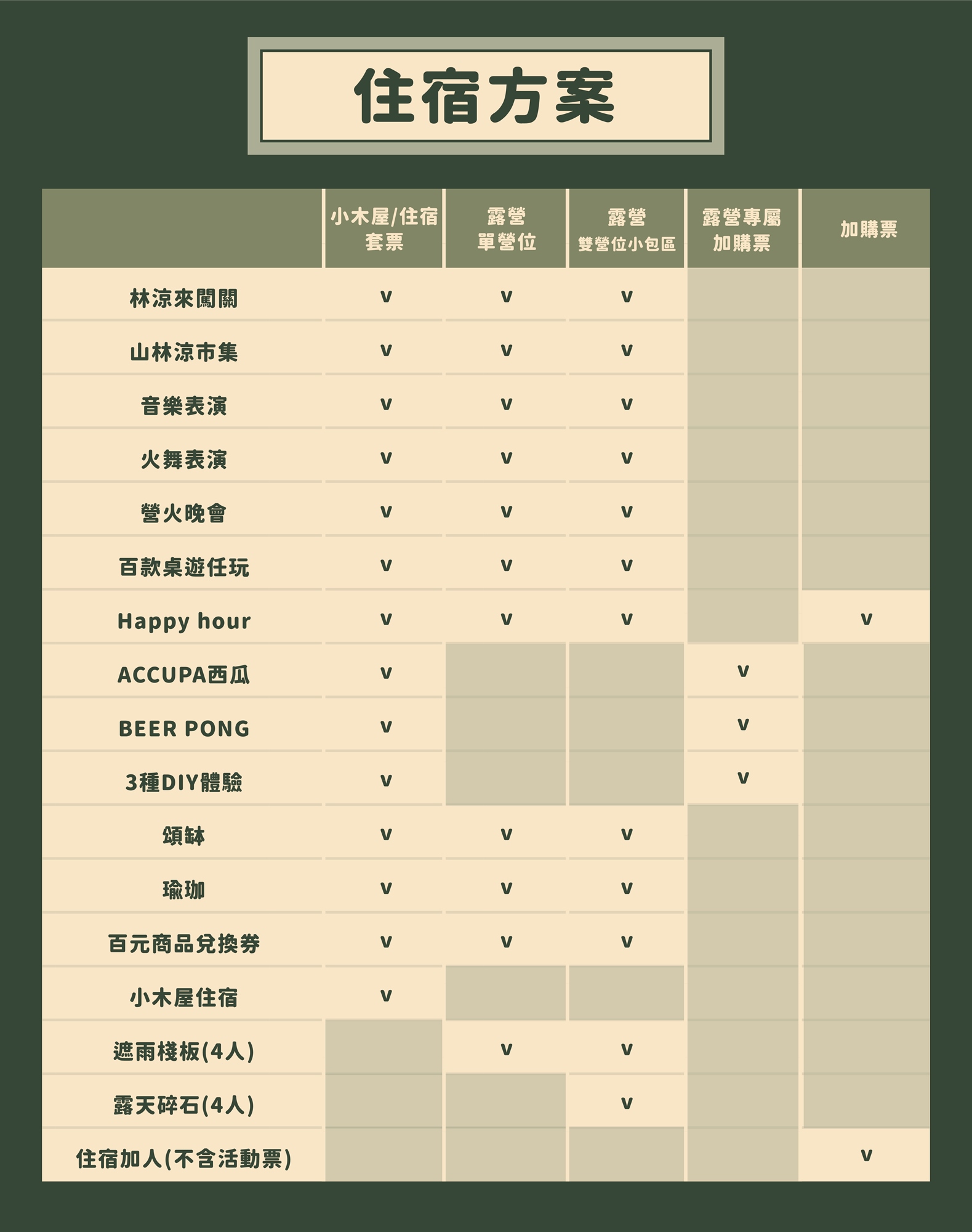 - 林涼超值推薦:林涼唯一指定購買◤ 住宿套票◥ !不只可以玩活動,還有小木屋讓你住!選擇露營的朋友可以加購◤ 露營專屬-活動加購票 ◥,滿足你所有的玩樂需求唷~