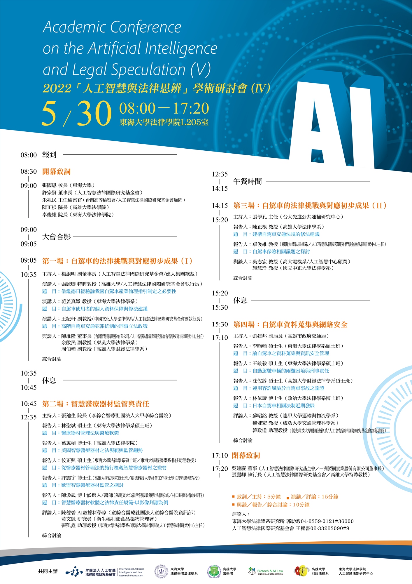 2022「人工智慧與法律思辨」學術研討會,現已邁入第五屆。本屆學術研討會計畫於2022年5月30日舉辦,並計畫以「人工智慧科技發展相關法制之探討」為主題,此次側重於自駕車及醫療器材,延續過往會議之舉辦方式,邀請國內人工智慧與法律學者專家研討;另一方面,為培養AI法律圈的人才,本次研討會亦規劃由東海、高大等校研究生參與報告,並鼓勵國內法律學及相關研究所之研究生,投入人工智慧科技發展與法學連結之研究,兼顧國際人工智慧科技與法學之潮流與脈動,因此規劃對外徵稿,徵求論文主題:「自駕車」或「智慧醫療器材」相關法制之探討,希望能提供學子更多學習與演練的機會。