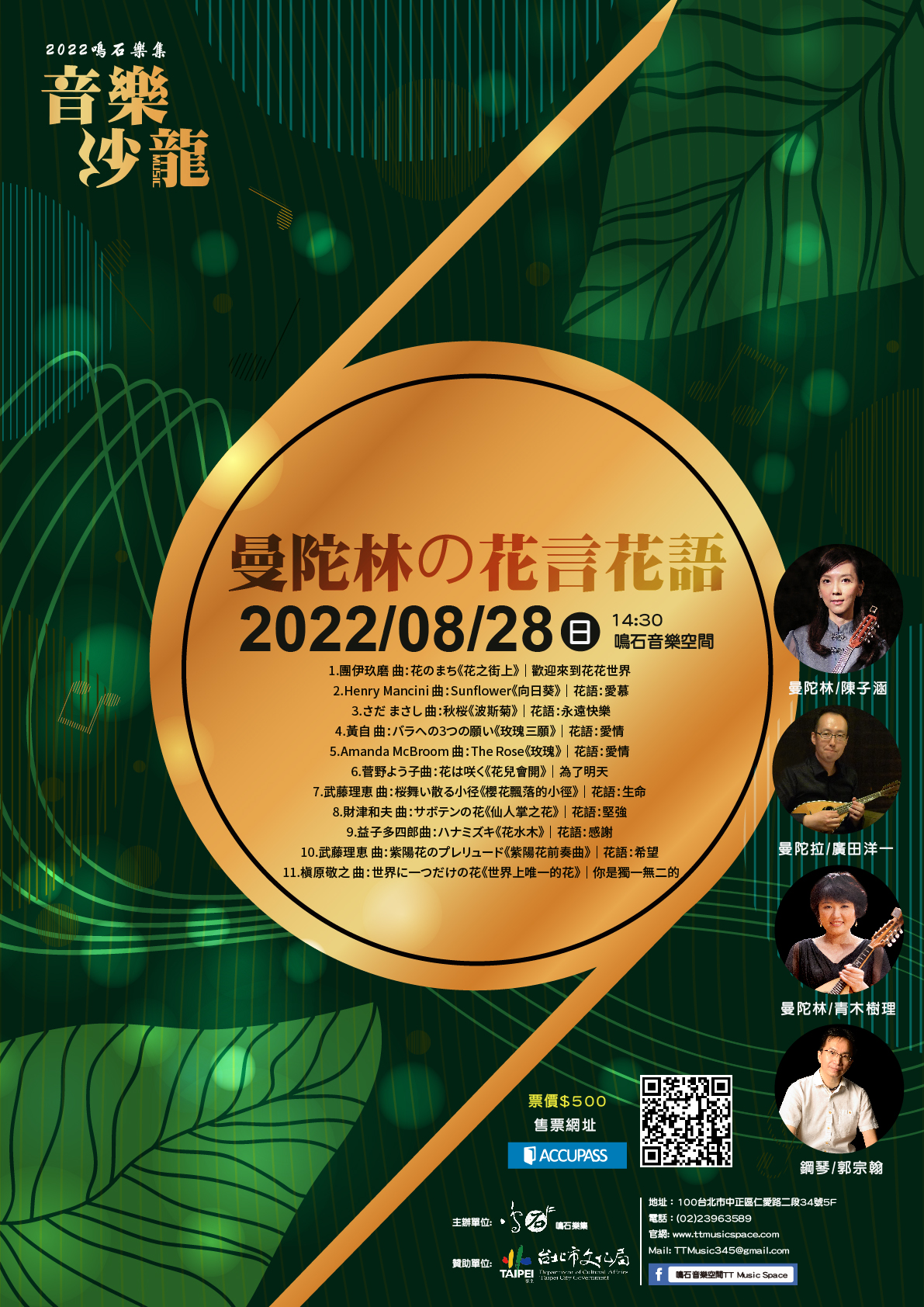 音樂與人的交流往往不需要語言就能心領神會,本場音樂會藉由多首跟花有關的樂曲,想藉由花語來帶給大家一股心靈的力量。這兩年在疫情下,人與人之間的距離彷彿很遙遠,但內心往往對所愛的人及所要關心的人卻不管距離多遙遠,愛永遠不變。本場音樂會特別邀請,臺灣曼陀林樂團團長陳子涵小姐與副團長廣田洋一先生與駐團作曲家郭宗翰先生一同合作演出,希望帶給大家滿滿的正能量與祝福。