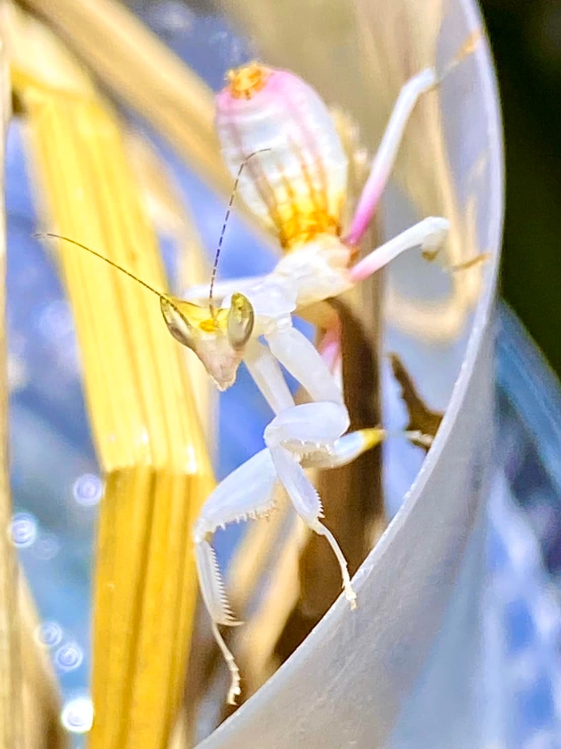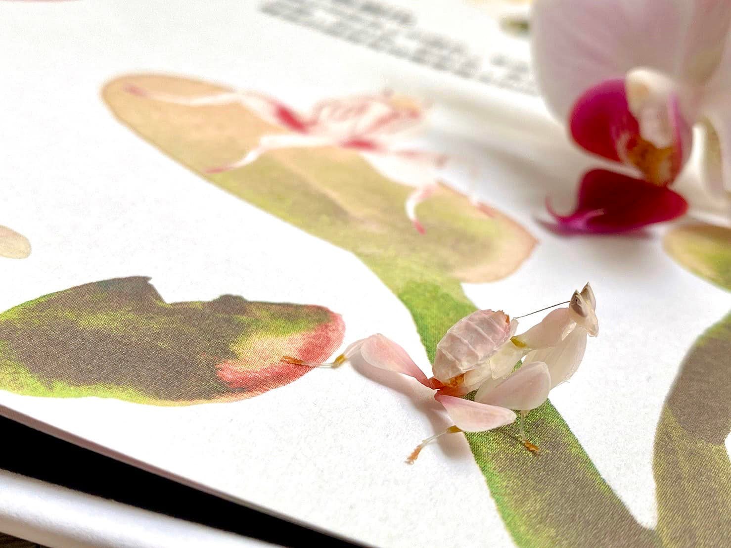 蘭花螳螂像極了盛開的花朵──白裡透紅的顏色、六隻腳彷彿花瓣、尾巴上有花蕊般的條紋。當牠用後足抓住枝條時,會將身體左右搖晃,模仿花朵在風中搖曳的樣子,讓自己看起來更誘人。