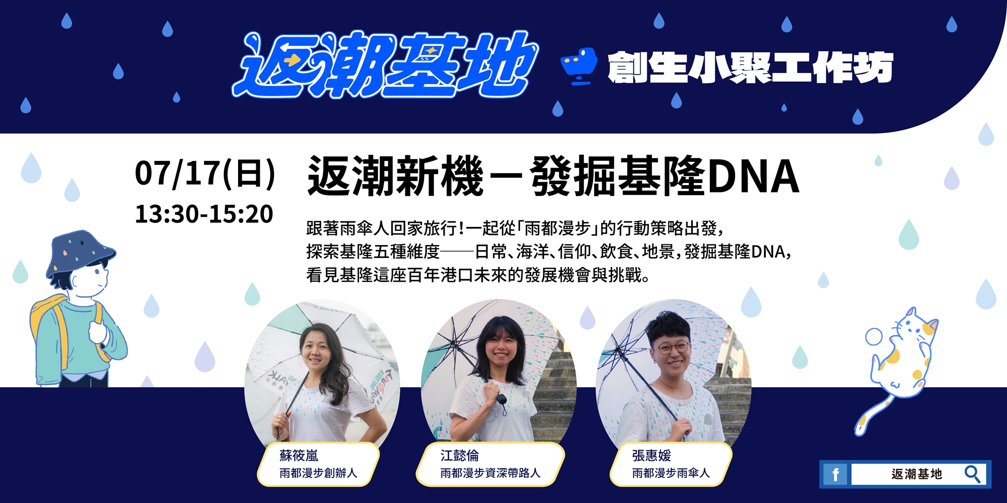 讓有雨都創業idea卻沒有資源及頭緒嗎?看見基隆的迷人之處但欠缺臨門一腳?植基於「國發會地方青年培力工作站」計畫,秉持「創新、創意、創業」的精神,結合「在地觀點」,雨都漫步成立「返潮基地(Keelung Workation)」,廣邀基隆創生前輩與青年,協力建立「基隆地域」品牌。