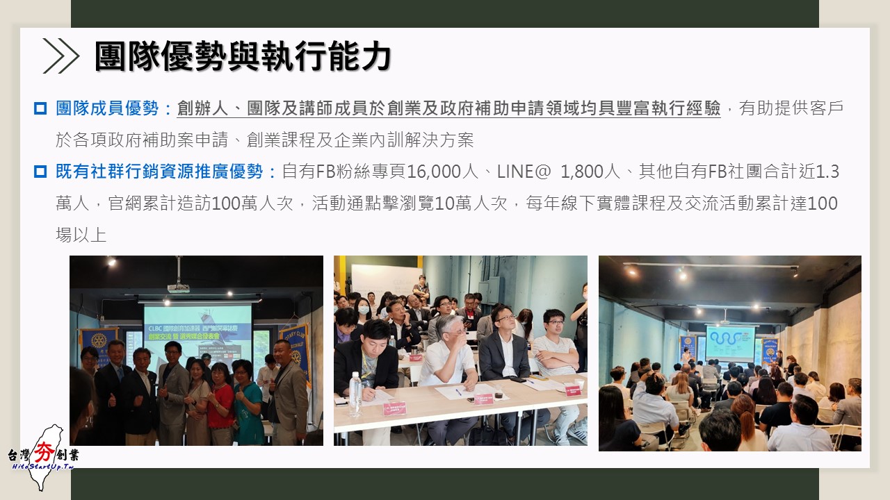 策略合作夥伴:CLBC、科智聯合會計師事務所、律聯國際智慧財產權事務所、凱斯整合行銷有限公司、銘傳大學創新育成中心