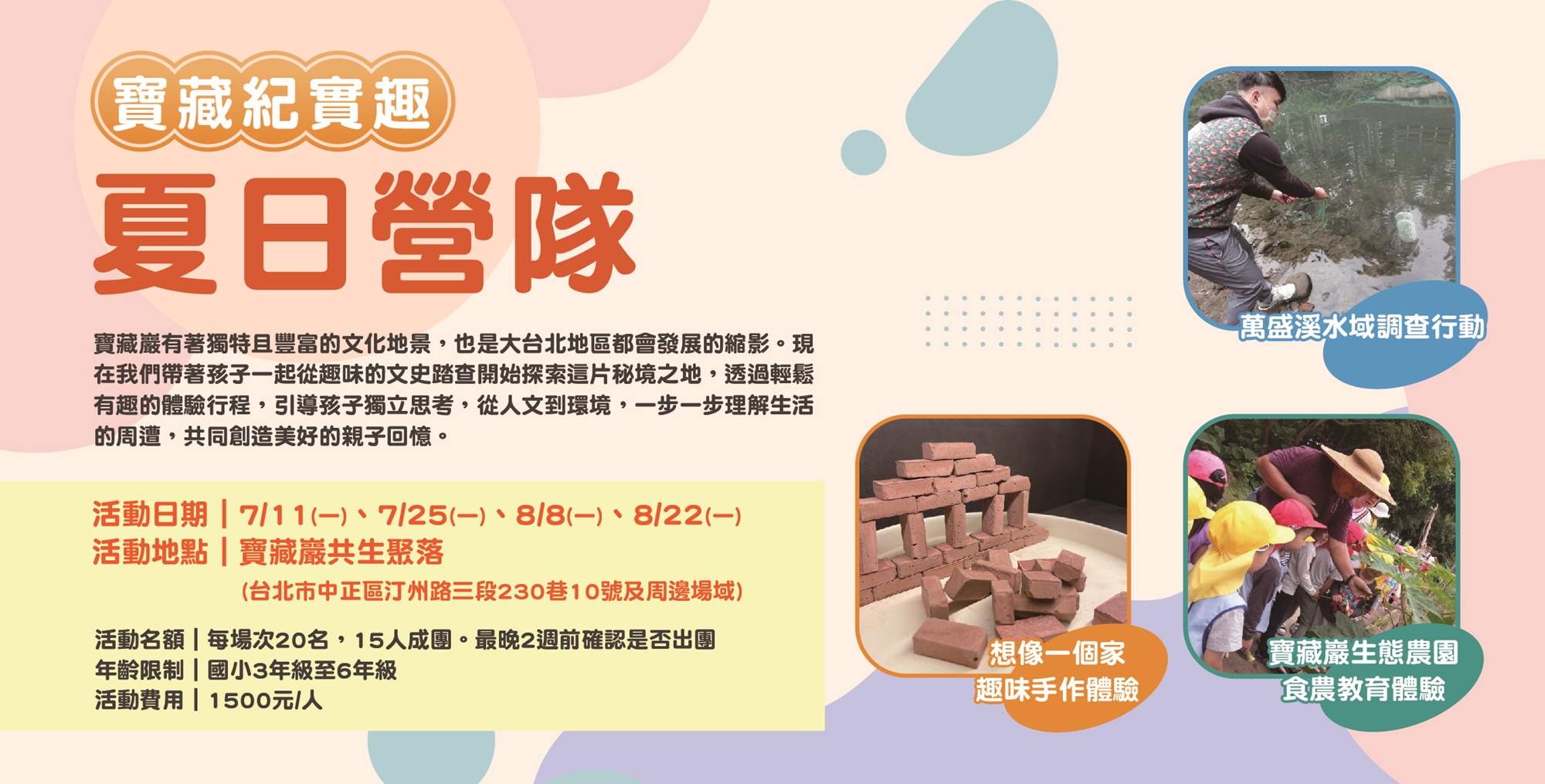 現在我們帶著孩子一起從趣味的文史踏查開始進入這片台北南區秘境之地,透過輕鬆有趣的導覽及手作體驗工作坊,認識寶藏巖的文化背景同時也引導孩子重新思考家的意涵,從人文資訊到環境永續,我們一起探索聚落周邊的日常環境,從水資源到食農體驗,一步一步理解環境與生活的永續經營,共同創造美好的親子回憶。