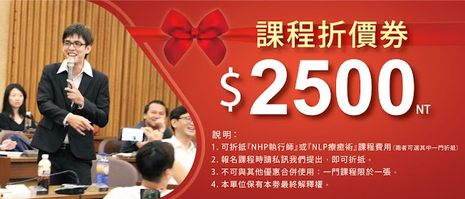 報名者,送2500元課程折價券!未來可全額折抵『NHP執行師』或『NLP療癒術』課程費用(兩者可選其中一門折抵)