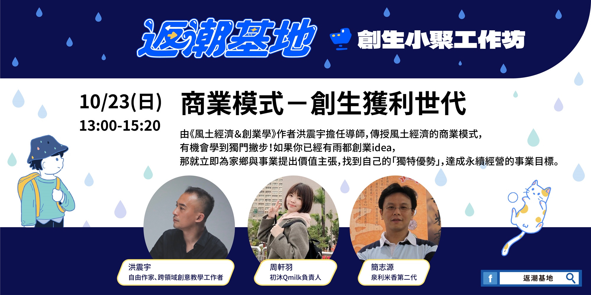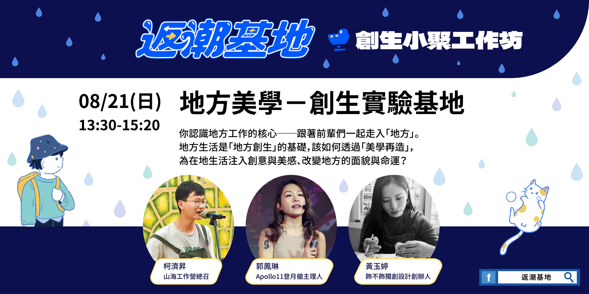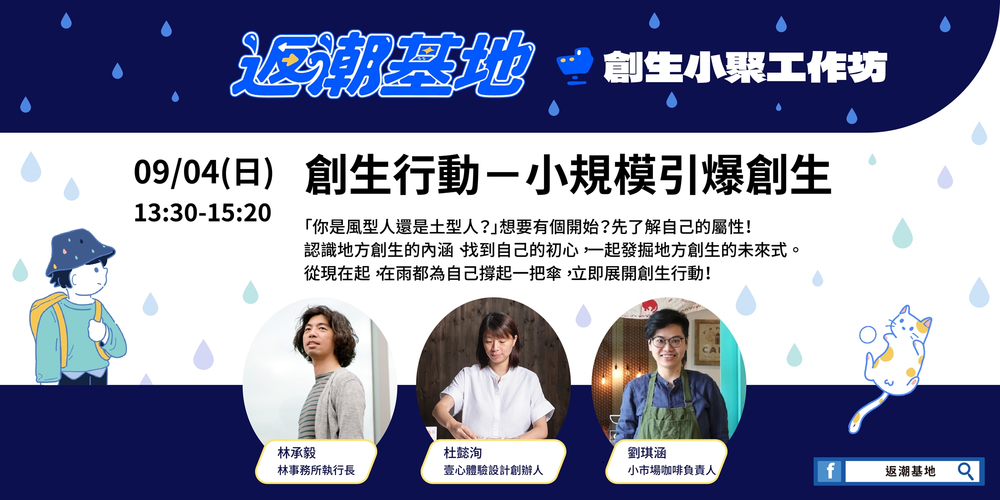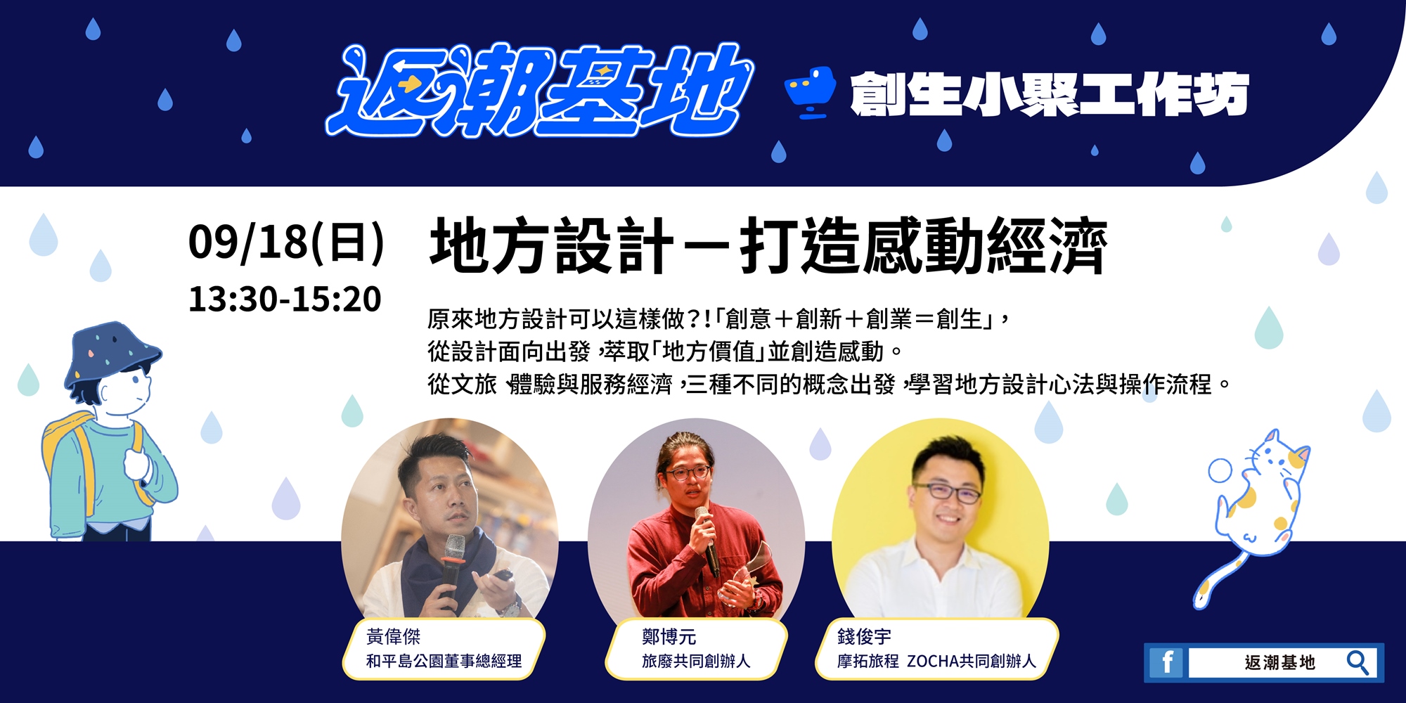 返潮基地再進階!工作坊以「地方創生小聚」的理念,邀請專家學者傳授「地方創生Know-How」、串聯基隆業師分享地方創生經驗。各場主題包含「地方特色觀察與採集」、「地方美學再造」、「創生行動實踐」、「從設計面向打造感動經濟」、「文化展演策略」、「邁向穩定獲利的商業模式」,跟創生前輩近距離接觸,用他們豐富的經驗引領基隆創生新浪潮,一步一步引領你完成地方創生事業提案!