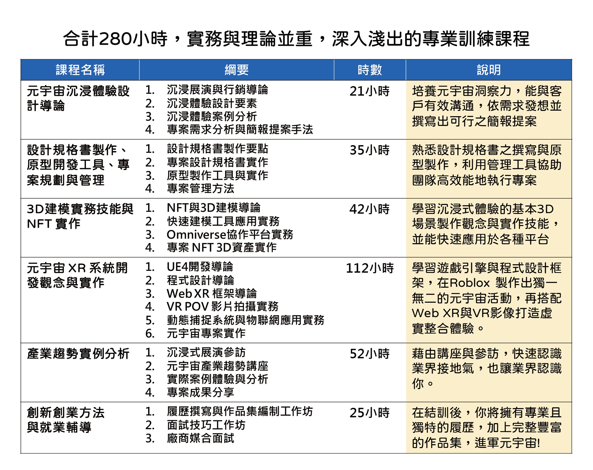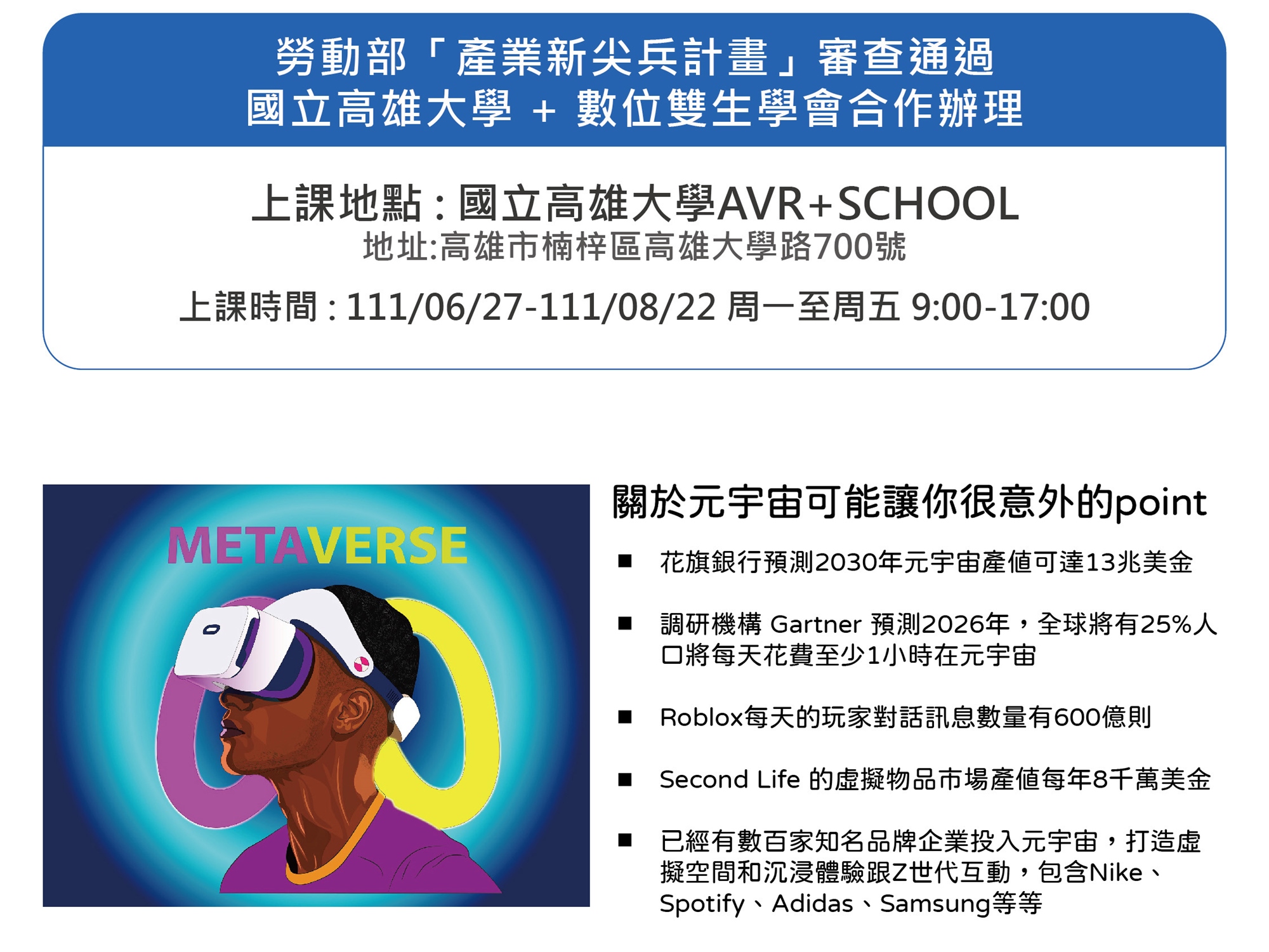 本課程由高雄大學AVR+ SCHOOL主辦,台灣數位雙生學會協辦。高雄大學除在校開設AVR微學程已近三年的時間,去年辦理之兩梯次新尖兵遊戲開發課程,也獲得非常亮眼的成績,學員多能夠找到理想的工作,或在下一個學習旅程中能夠具備實務能力,更能學以致用。本課程從元宇宙基礎觀念講起,包含發想提案、細部設計、場景建置、以及在元宇宙遊戲平台實作,讓零基礎的學員也能清楚理解元宇宙的商業模式,設計元素、以及技術框架;課程中也加入了大量的業界講師,藉由經過市場驗證的實例經驗與實際場域之參訪,帶著學員親自體驗業界實績,並且一步步實作元宇宙專案。