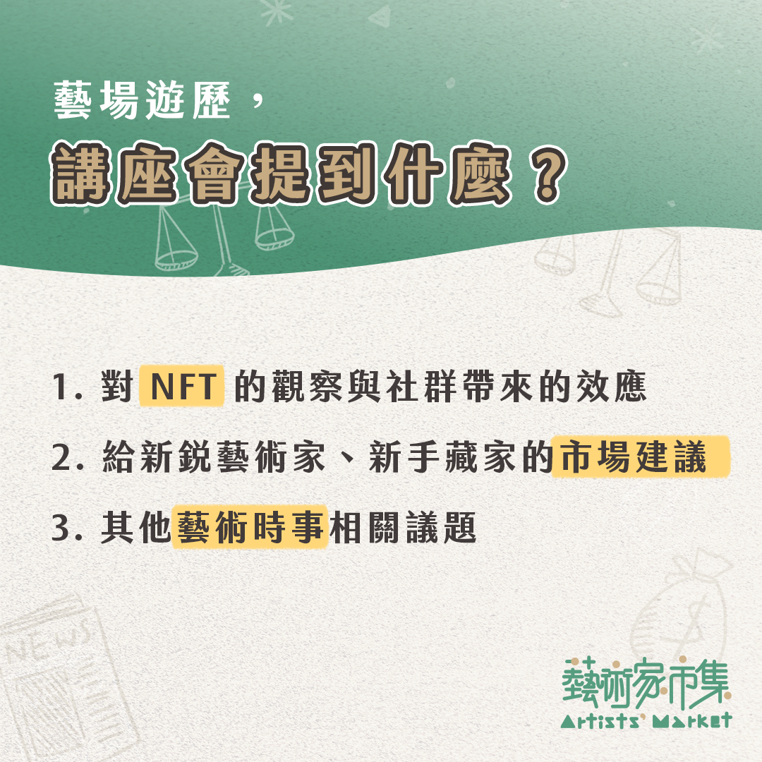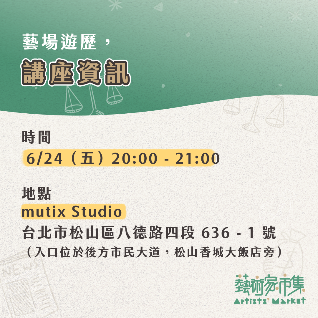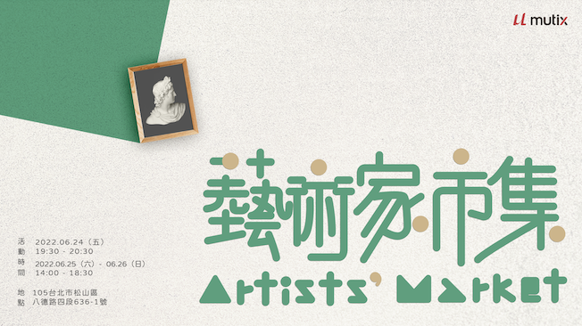 就在講座隔日的 6/25、6/26,將在台北松山 mutix Studio 舉辦「 Artists’ Market 藝術家市集:寄語」,與 13 位藝術家、上百件的藝術作品相遇 ,詳細活動資訊