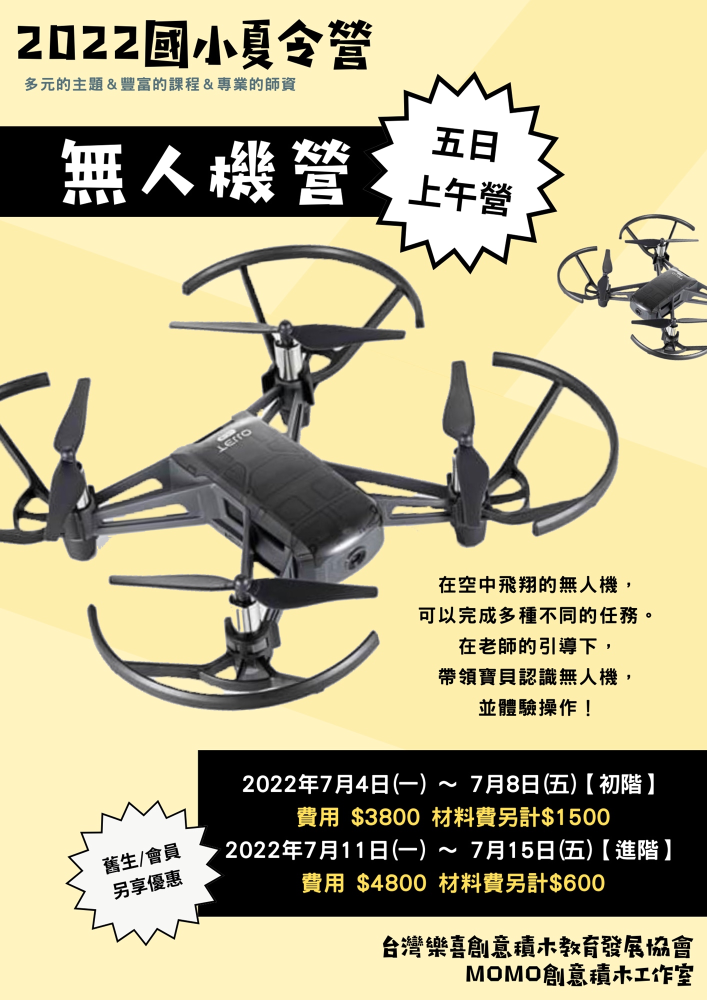 | 無人機營(進階) | 2022/7/11(一) - 2022/7/15(五) | $4800 不含材料費 | 材料費另計 $600 |