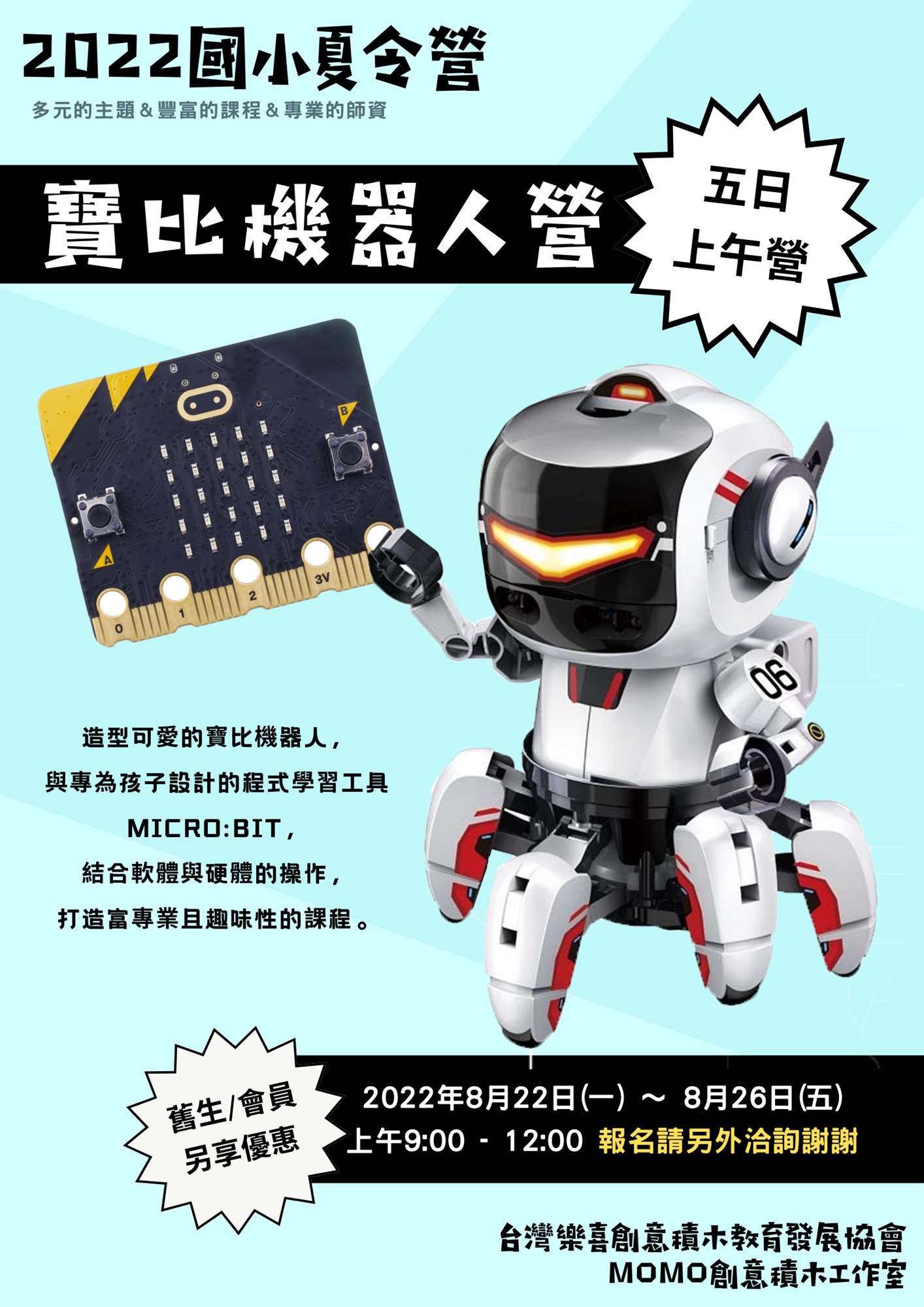 | 寶比機器人營 | 2022/8/22(一) - 2022/8/26(五) | 以寒假營有上過的寶貝為主,欲報名請另詢 | |