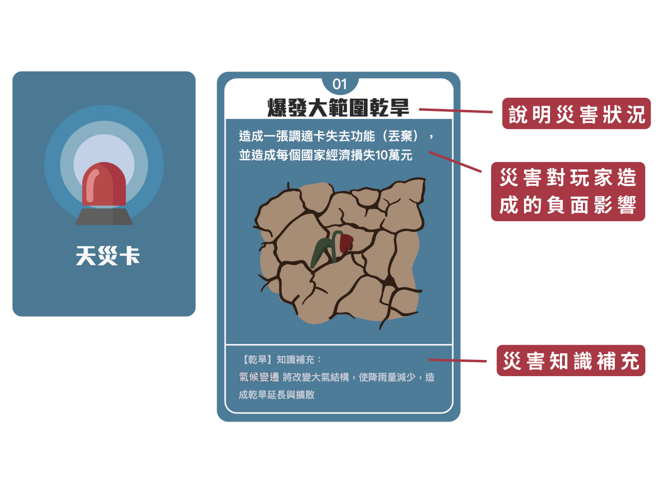 天災卡包含10種因氣候變遷導致的自然災害,並附加了知識補充欄位,兼顧遊戲好玩與知識性!