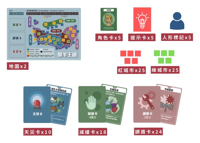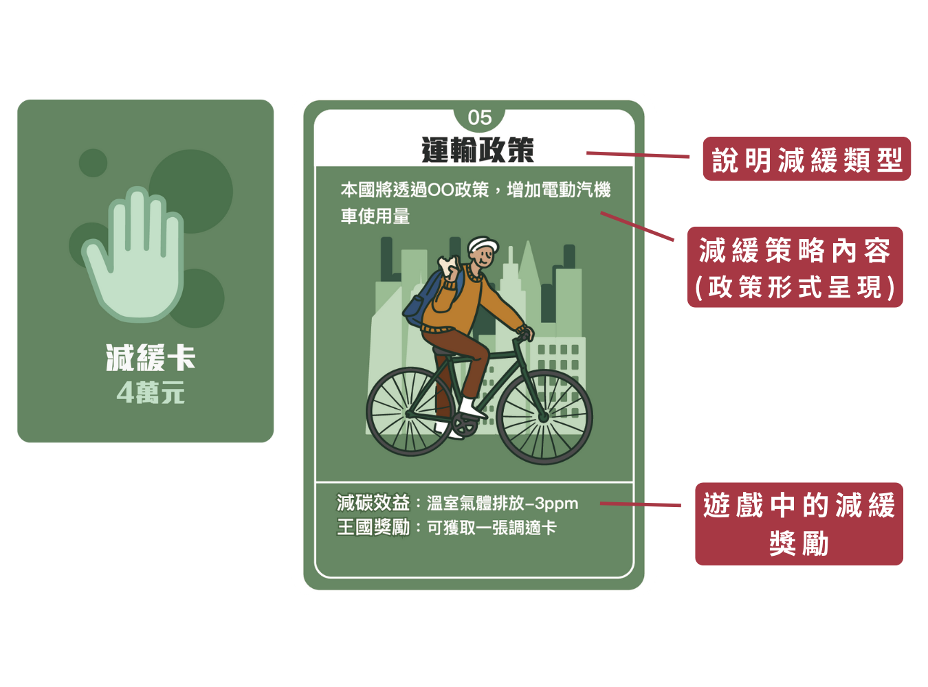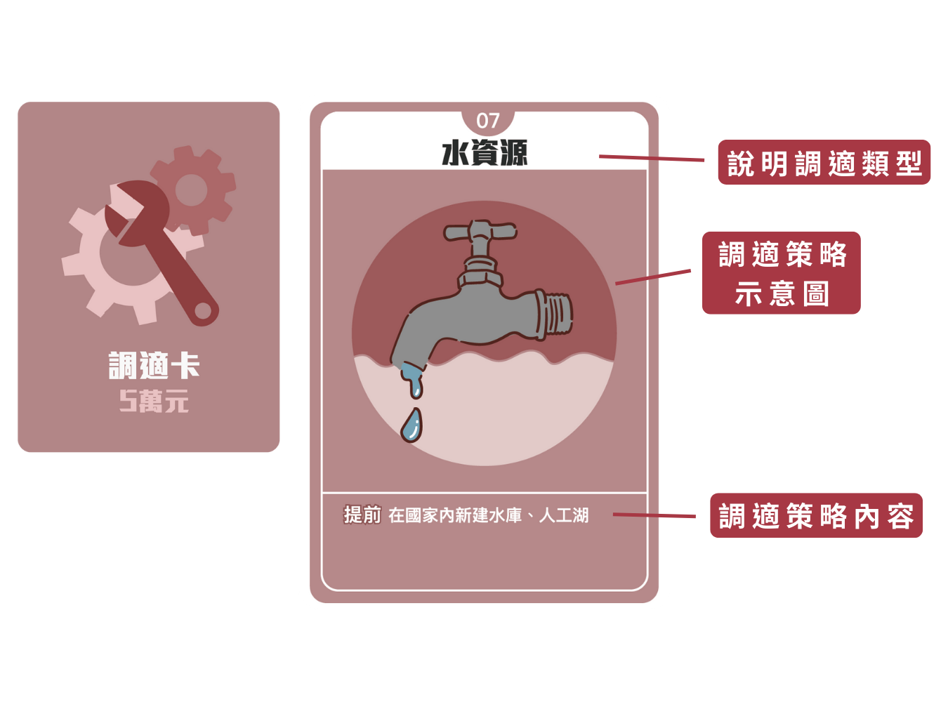 「減緩與調適」是因應氣候變遷問題的兩大策略,此遊戲設計了6種減緩卡、8種調適卡