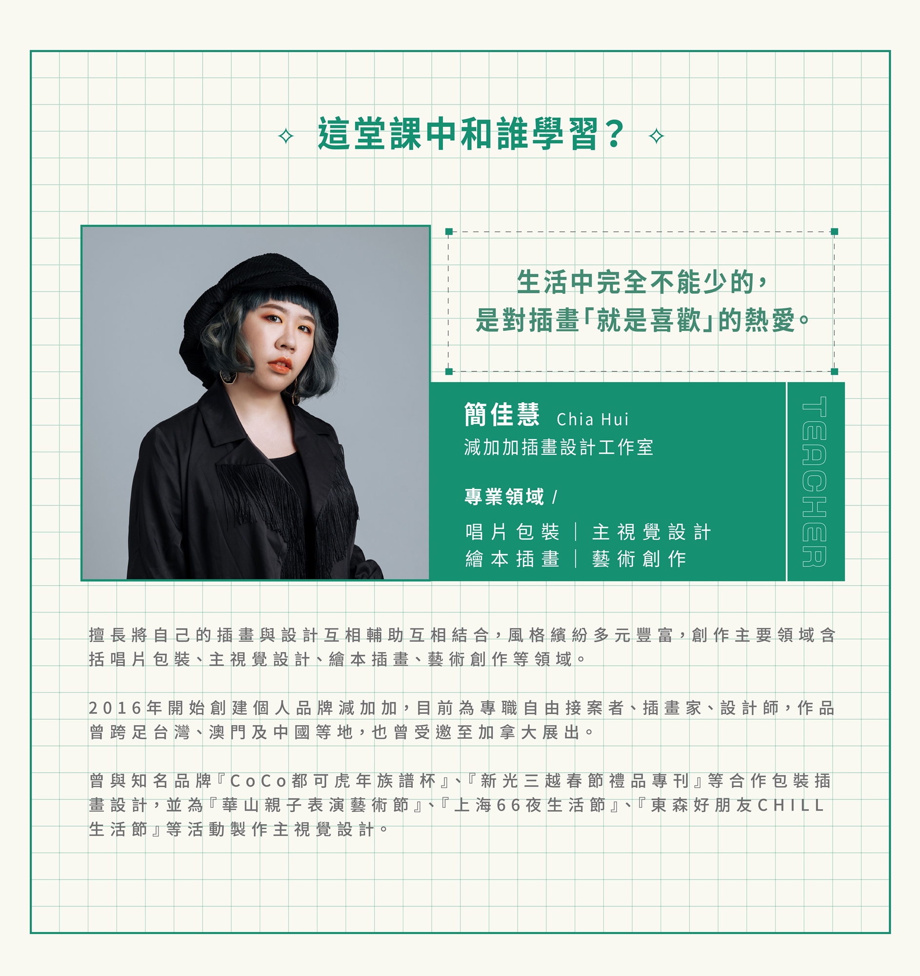 特別邀請到減加加插畫設計工作室主理人【 簡佳慧 Chia Hui 】