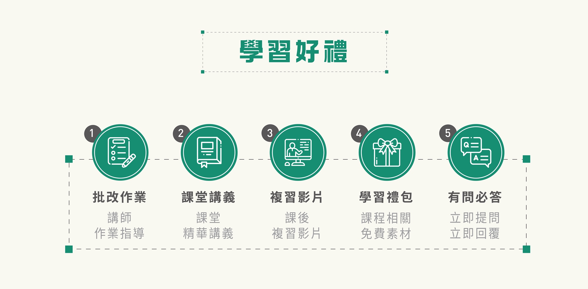 - 提供每堂課堂精華講義與相關影片複習與內化課堂所學