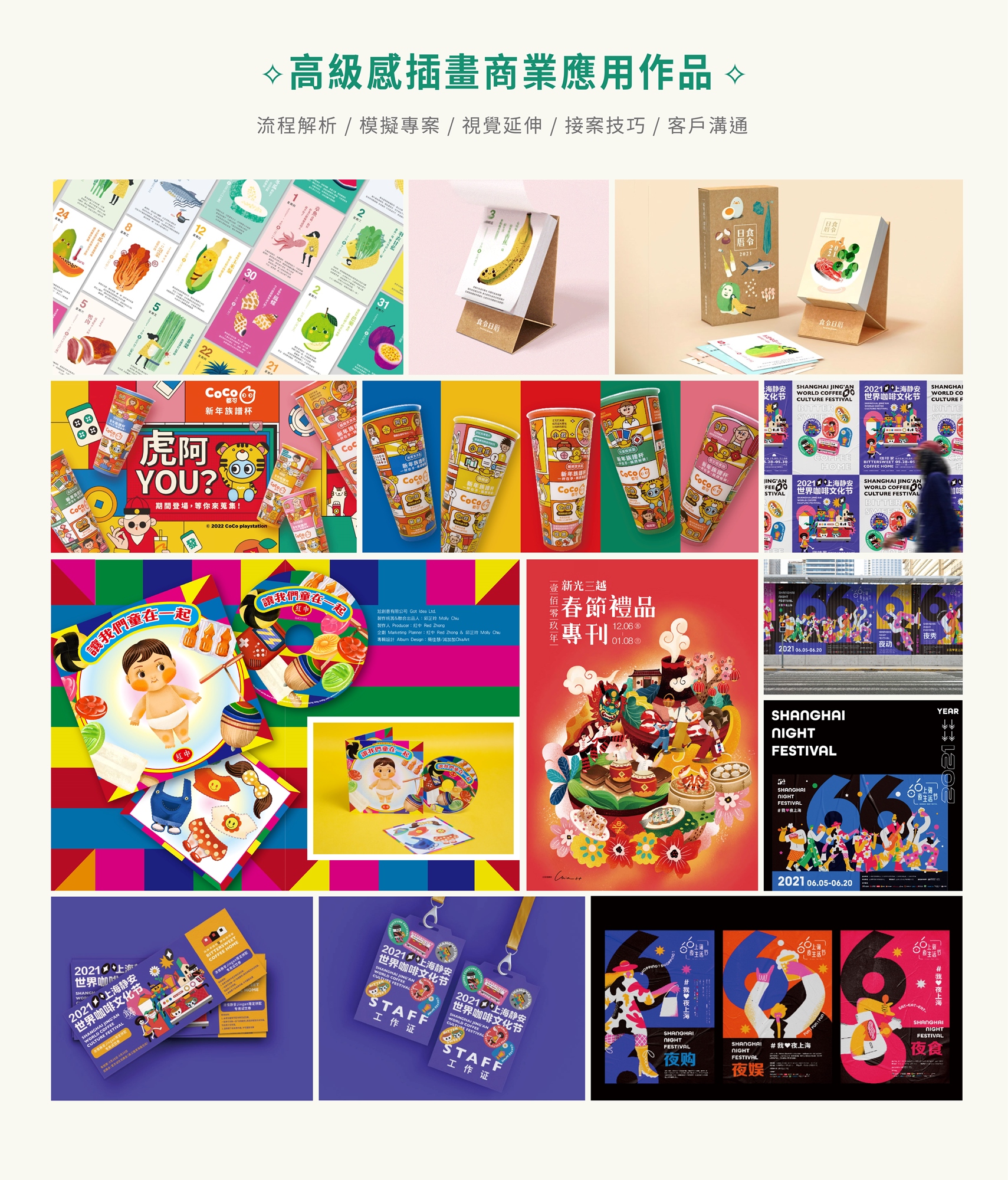 ● 曾與知名品牌『CoCo都可虎年族譜杯』、『新光三越春節禮品專刊』等合作包裝插畫設計,並為『華山親子表演藝術節』、『上海66夜生活節』、『東森好朋友CHILL生活節』等活動製作主視覺設計。